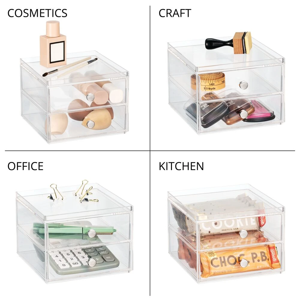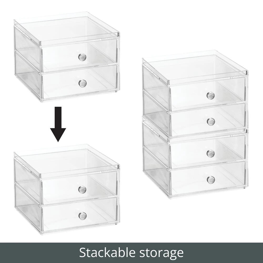 Our 2-Drawer Stackable Organizer brings order to everyday living. This two-tier organizer features an easy-grip front knob and clear, pull-out drawers that store makeup, jewelry, and other small accessories. Stack multiple bins together to create space-saving storage or line up multiple organizers to create a larger storage station that works for you.