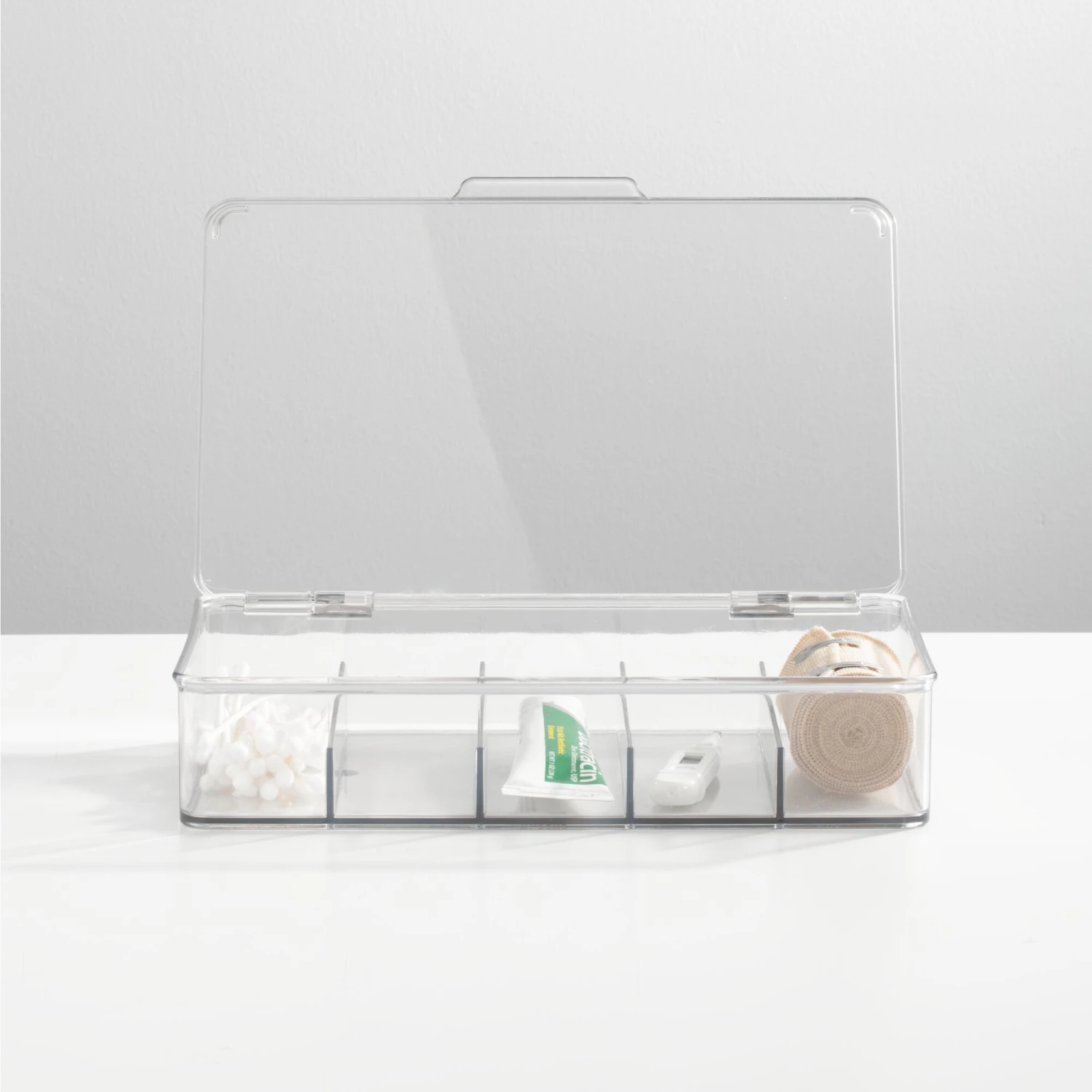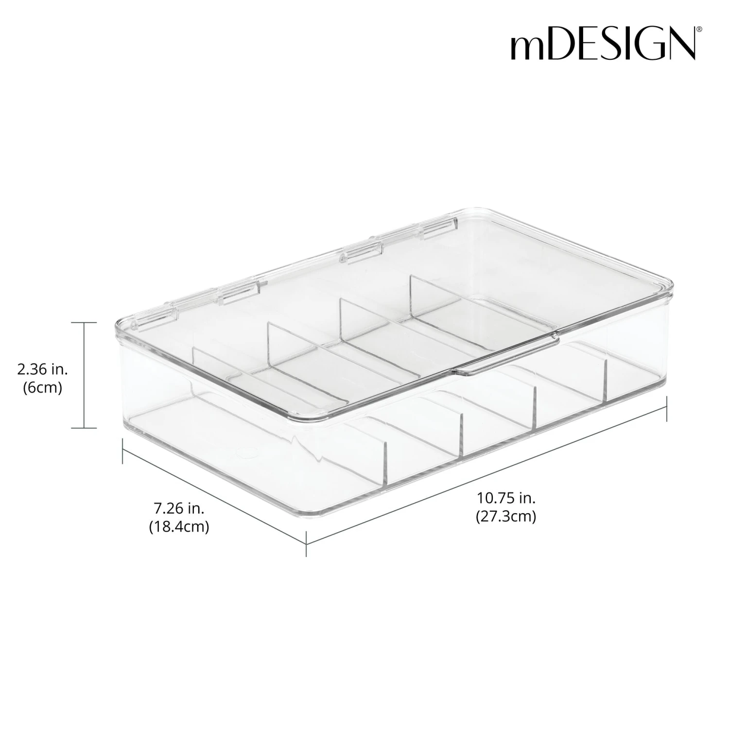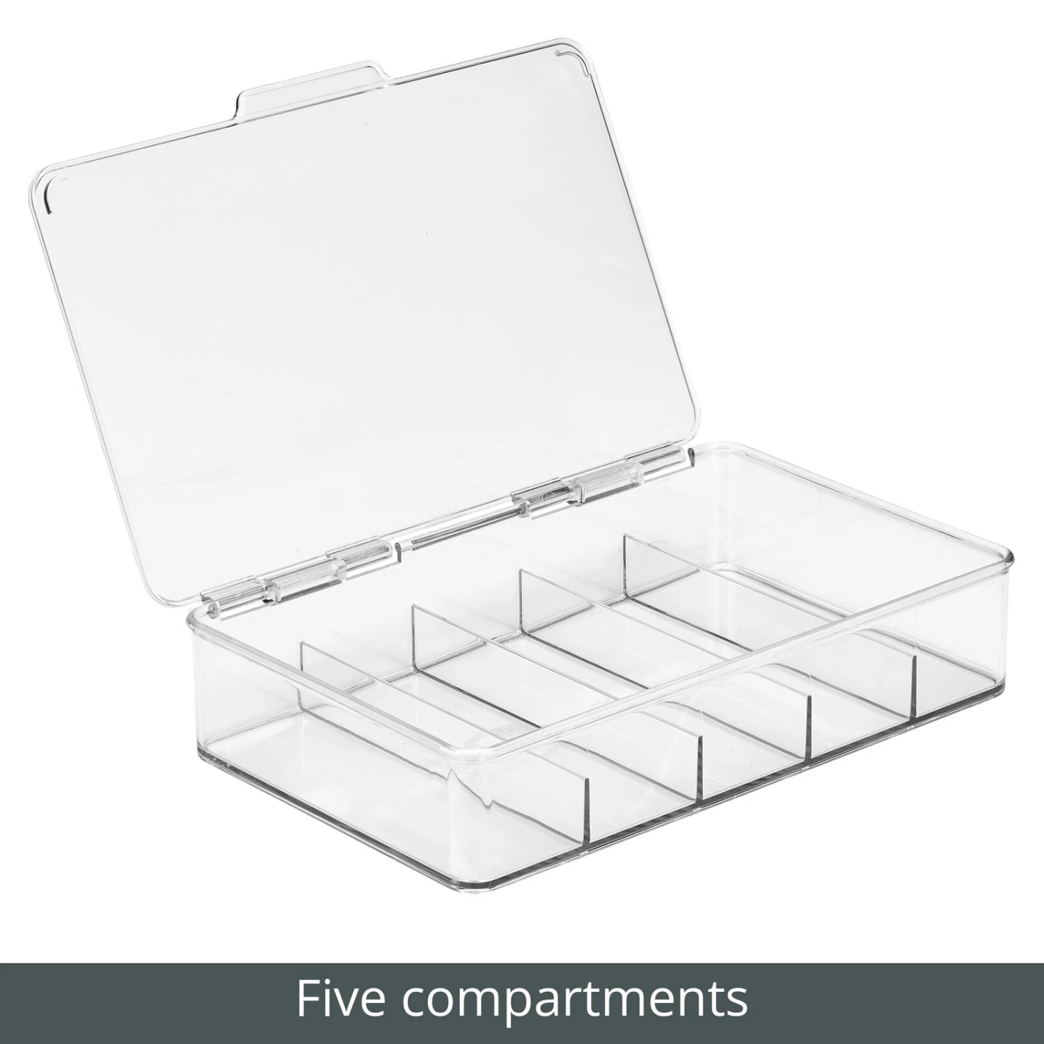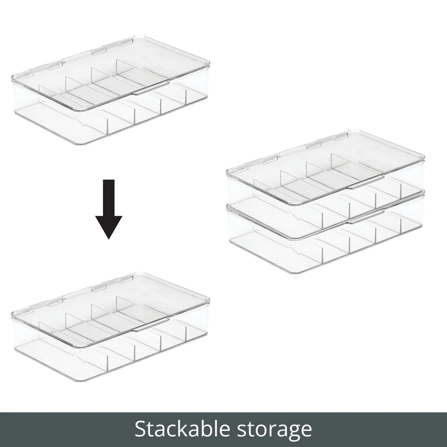 Our Stackable Bathroom Bins are the smarter way to organize countertops, cabinets, and closets. Five divided sections hold small accessories like hair ties, makeup, and jewelry in one convenient location. The easy-open lid keeps contents protected and organized, while the stackable design utilizes vertical space for custom bathroom storage.