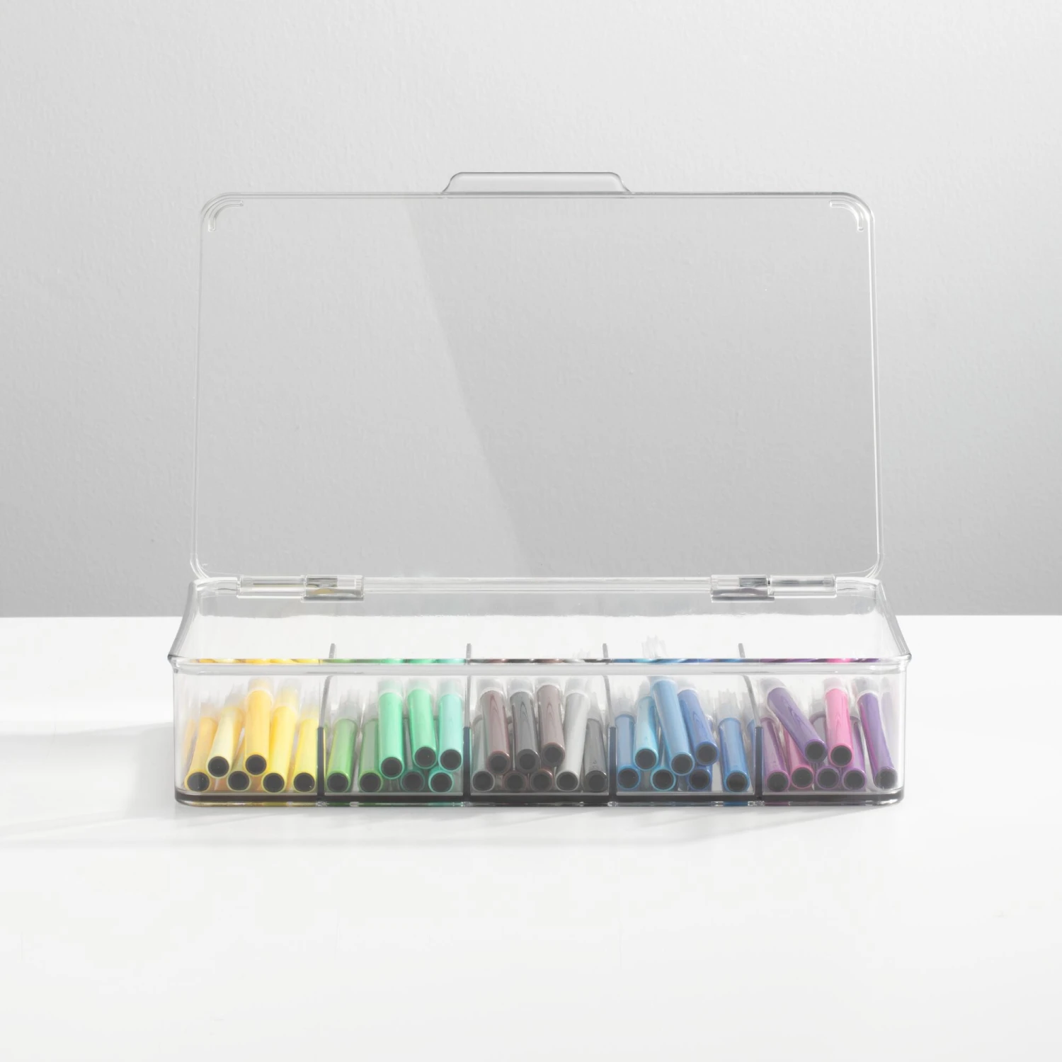 Don’t let playroom clutter take control. Our Stackable Toy Bin is the handy helper you need to tame toys of all shapes and sizes, making for quicker clean-up times. Five divided sections hold small items in one convenient location. The easy-open lid keeps toys protected and organized, while the stackable design frees up floor space.