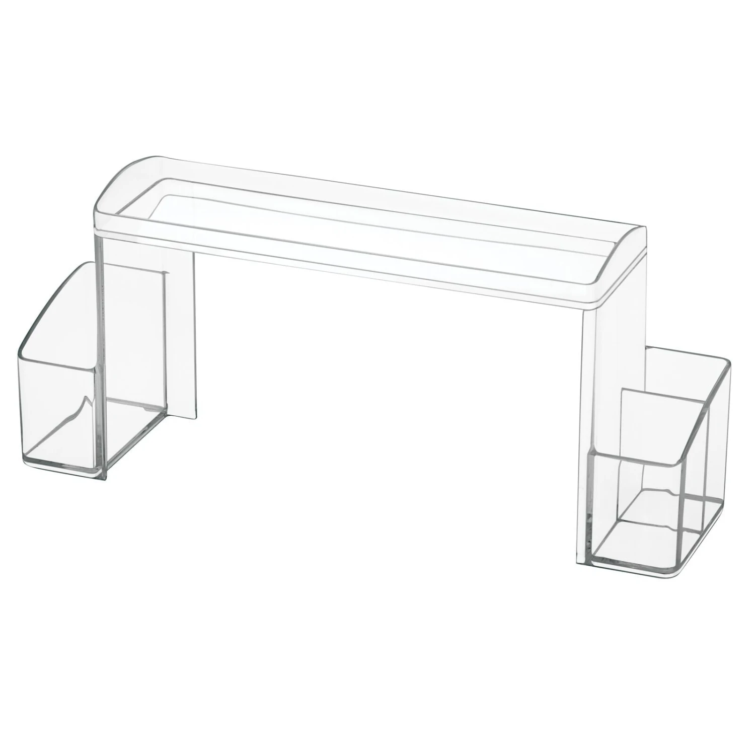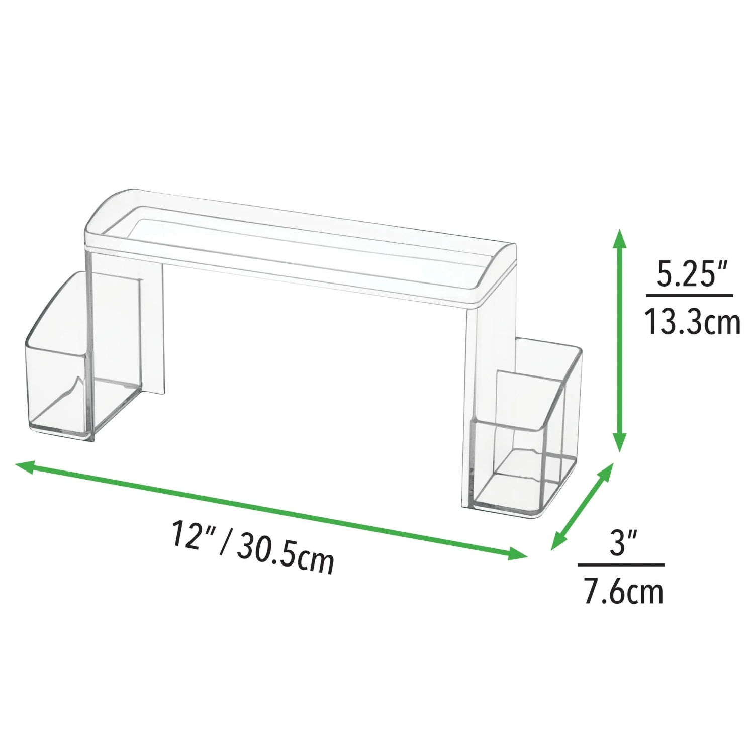 Clever 2-tier holder fits neatly on sinks and inside cabinets for efficient storage. The unique bridge design allows you to fit items on top as well as underneath. Featuring three side compartments, use this space to hold medication, makeup, and more with ease. This convenient holder can be used throughout the home for custom storage.