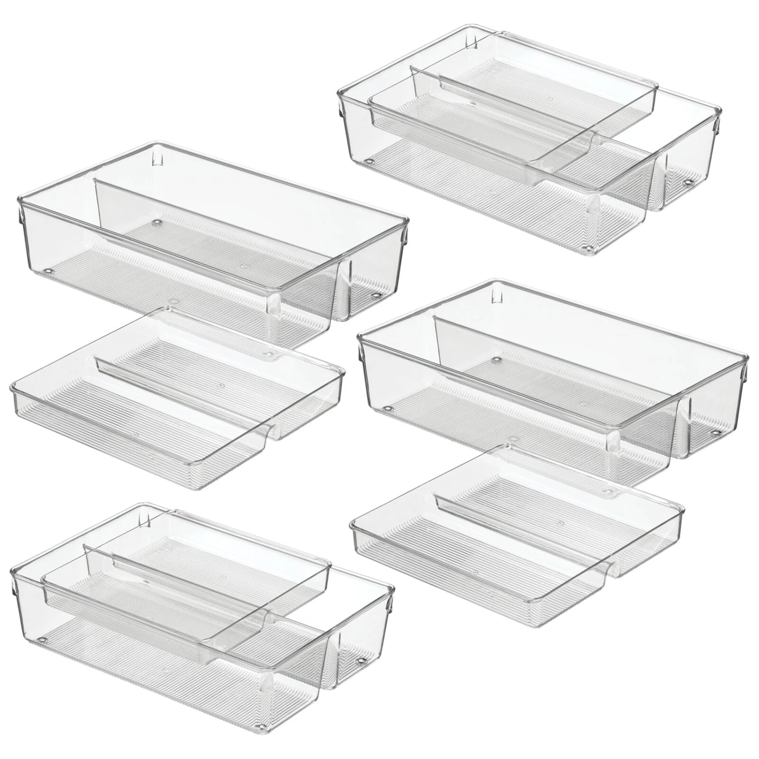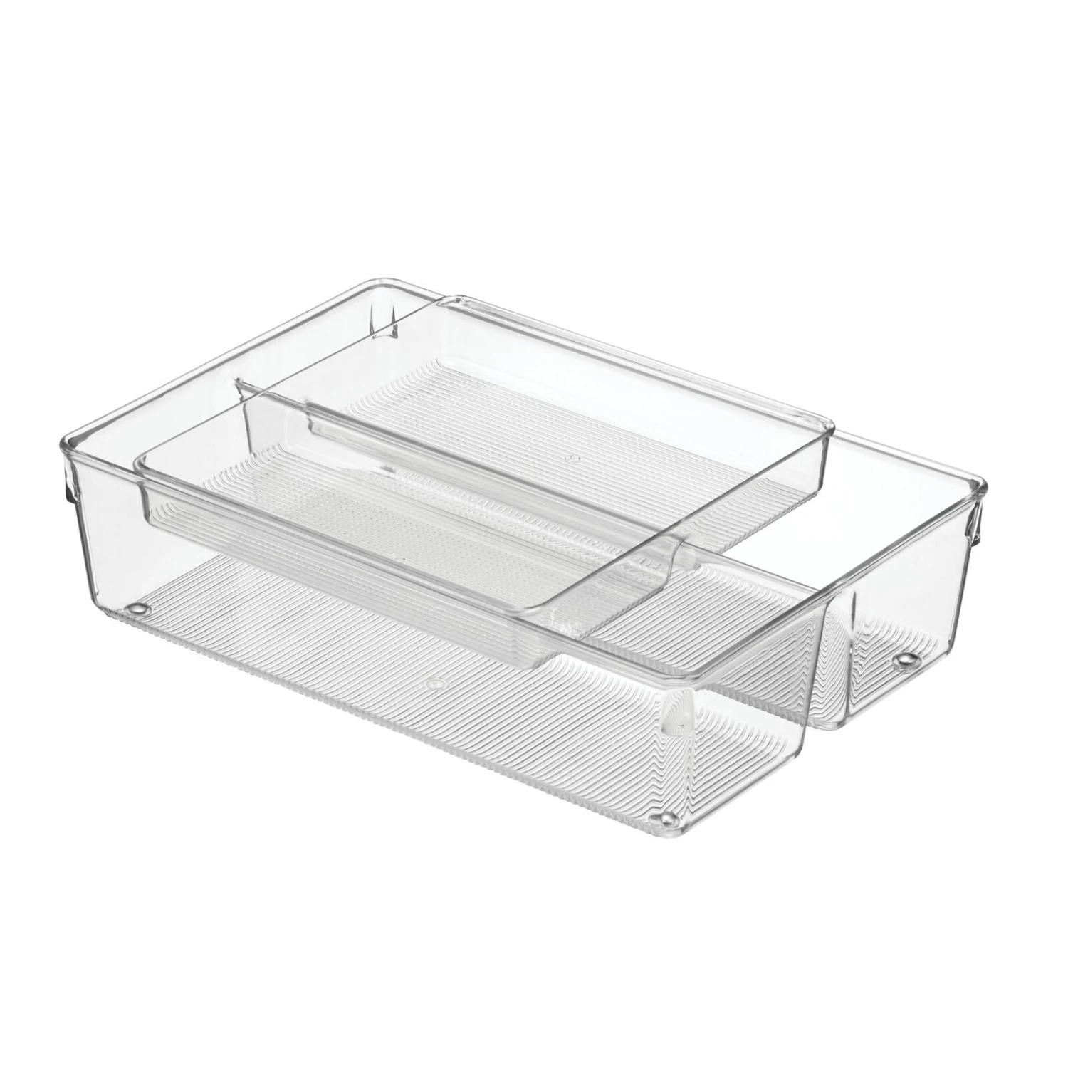 Create order inside cluttered drawers with our 2-Tier Drawer Organizer. The top tray stacks neatly on top of the larger tray to create a two-level storage option inside kitchen drawers. Each tray features two divided sections for easy organizing. For easy access, the top tray slides back and forth to allow access to contents underneath.
