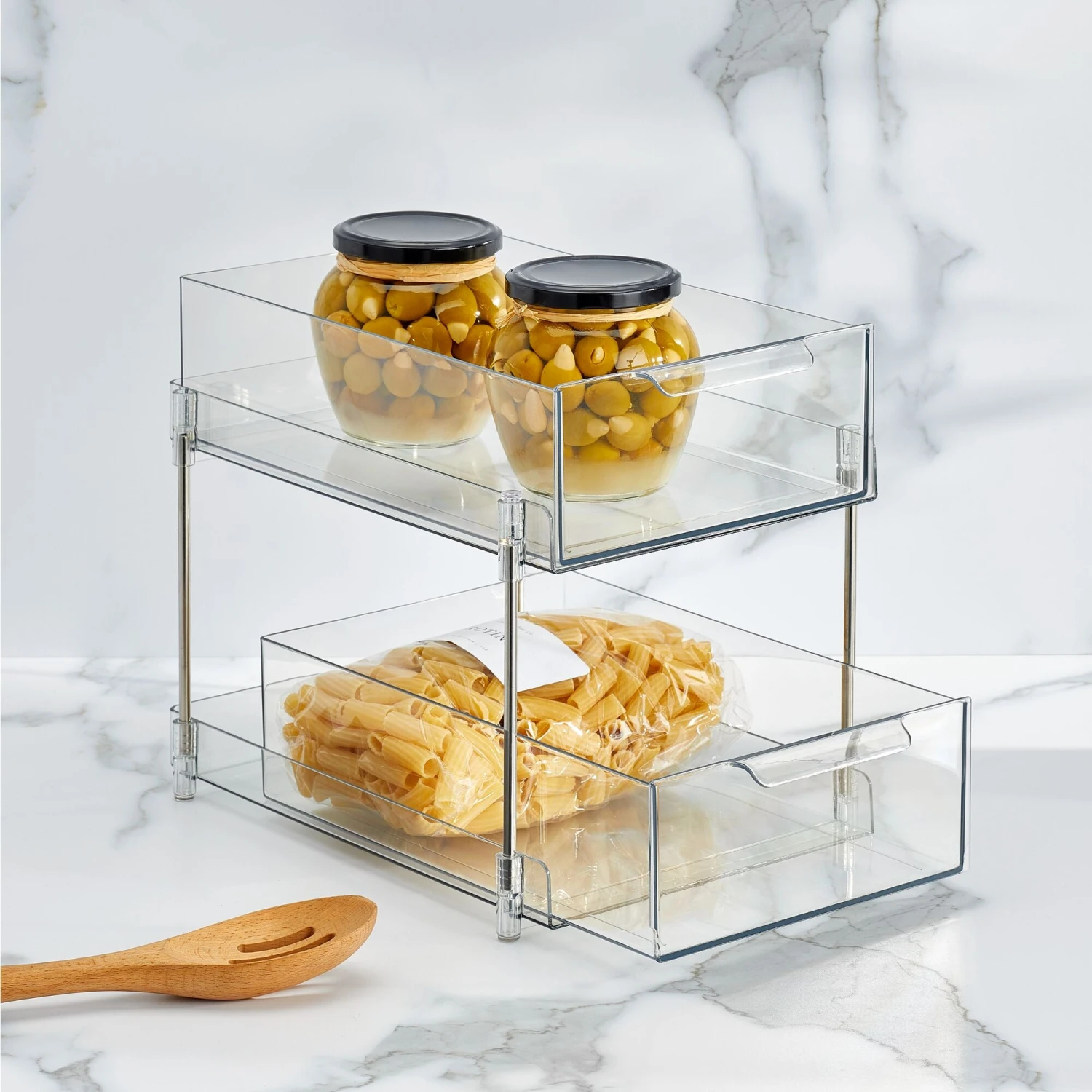 Our 2-Tier Organizer from our Nate Home by Nate Berkus collection features two open drawers that pull out allowing you to organize contents while creating the perfect catchall in any kitchen, bathroom, or home office. These easy-sliding drawers fit on any shelf, inside cabinets, and work as an under-sink organizer for discreet yet usable storage.
