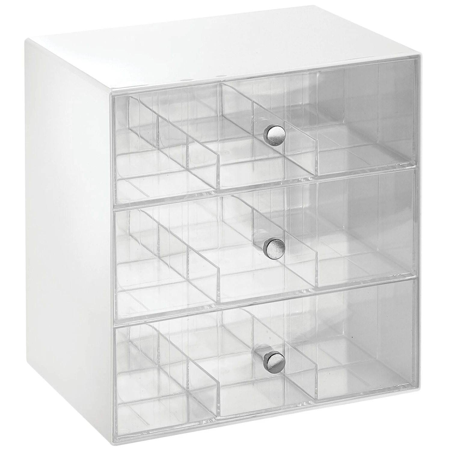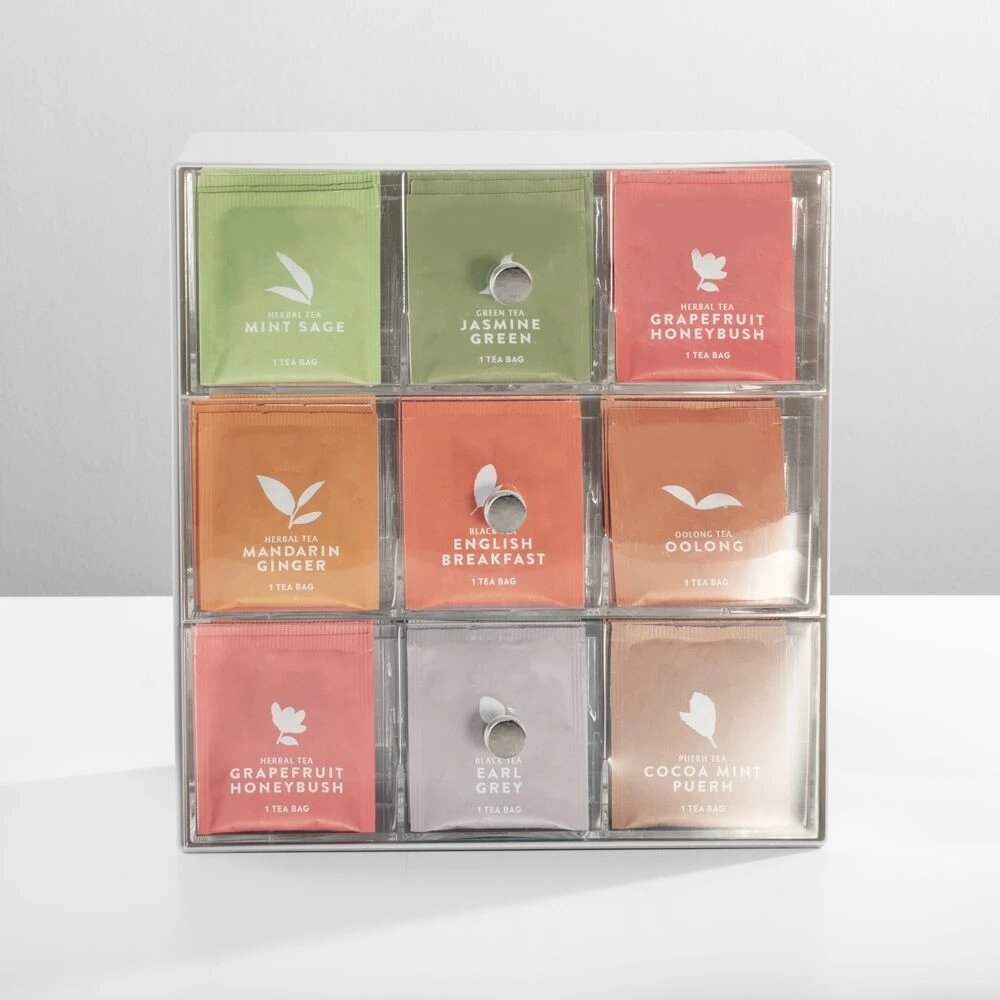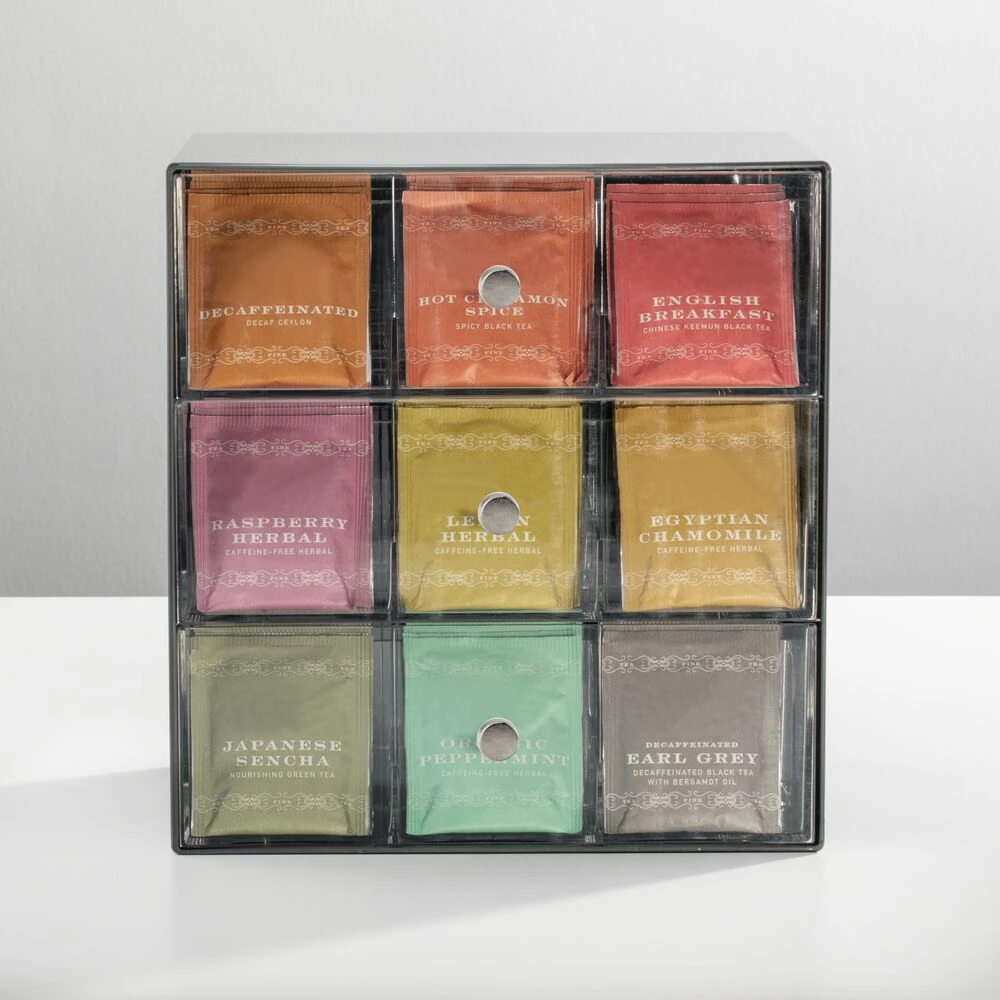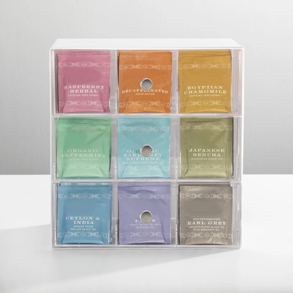 Combat countertop clutter with our 3-Drawer Stackable Kitchen Organizer. Three-tier organizer features a front knob and clear, pull-out drawers that hold tea bags and other small items. Each drawer features nine permanent compartments to eliminate bulky tea boxes on counters. Stackable design can be used together or separately for custom storage.
