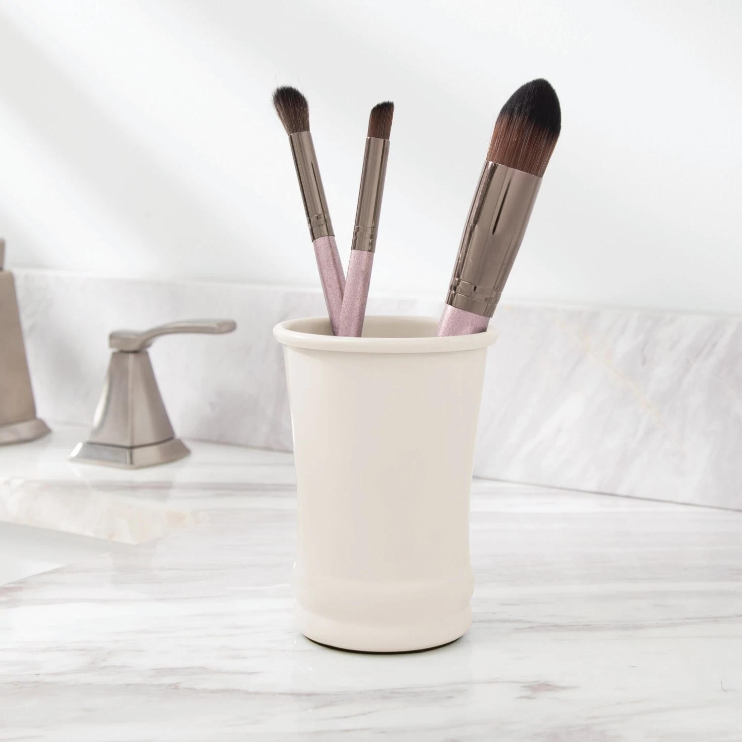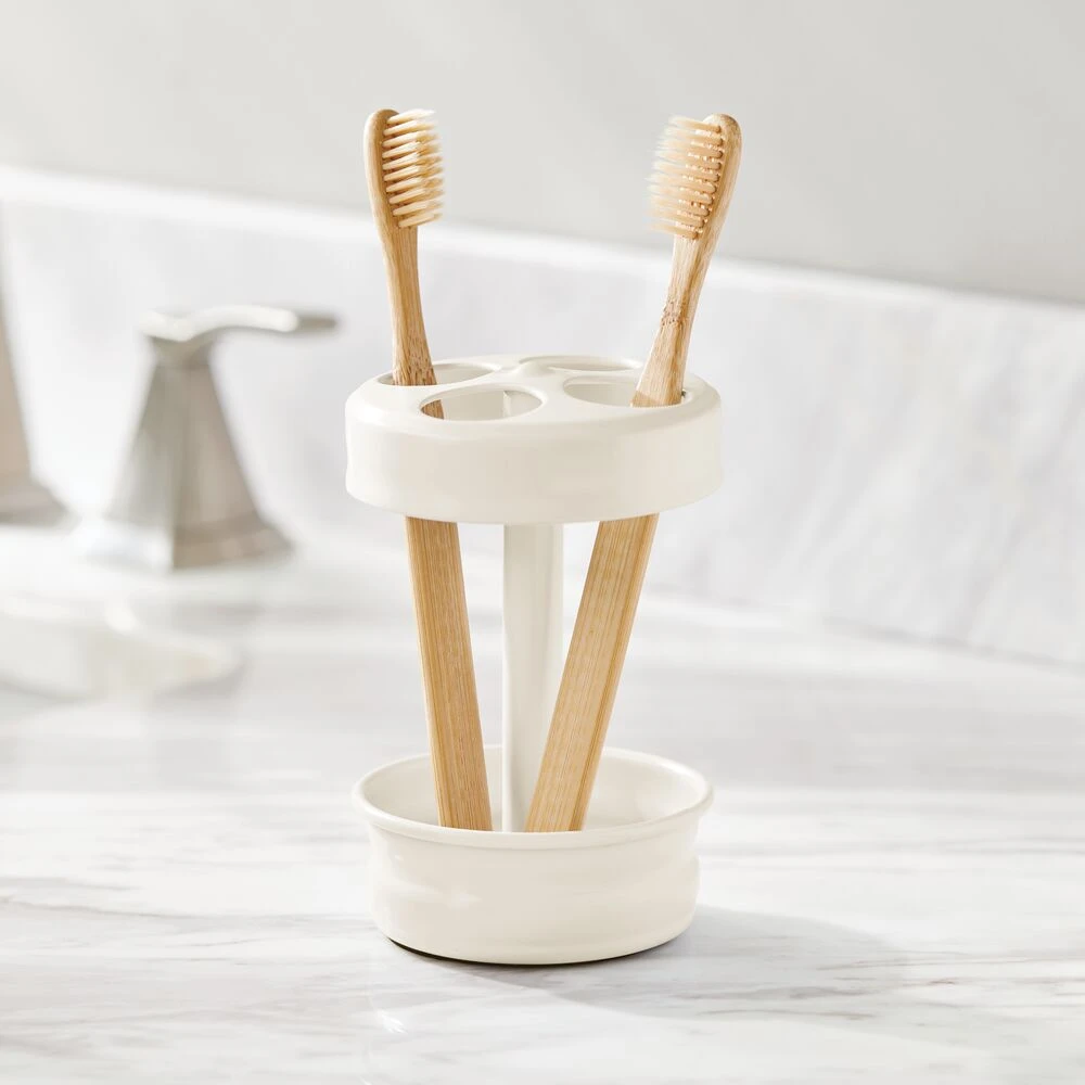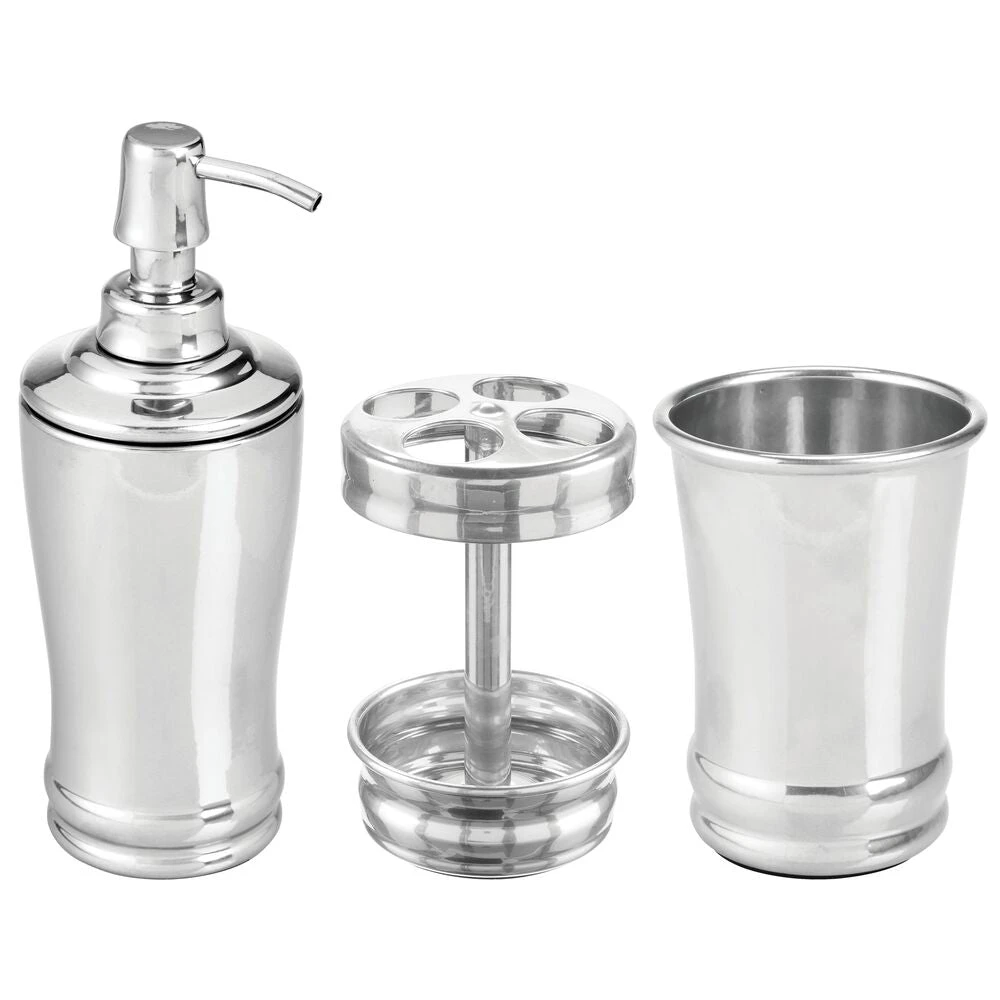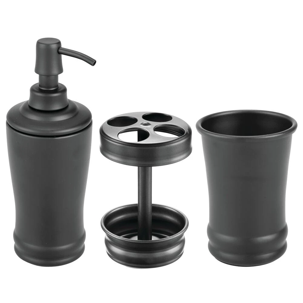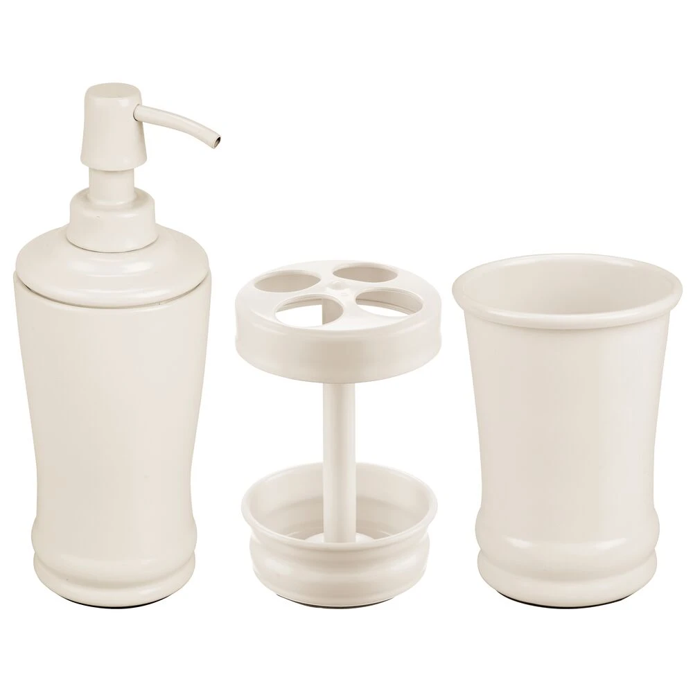 Create a cohesive look in any bathroom with this matching set, which includes a refillable liquid soap dispenser, divided toothbrush stand, and a tumbler rinsing cup. Perfectly sized for large or small bath spaces, these sink-side necessities elevate your bathroom vanity while simplifying your morning and nighttime rituals.
