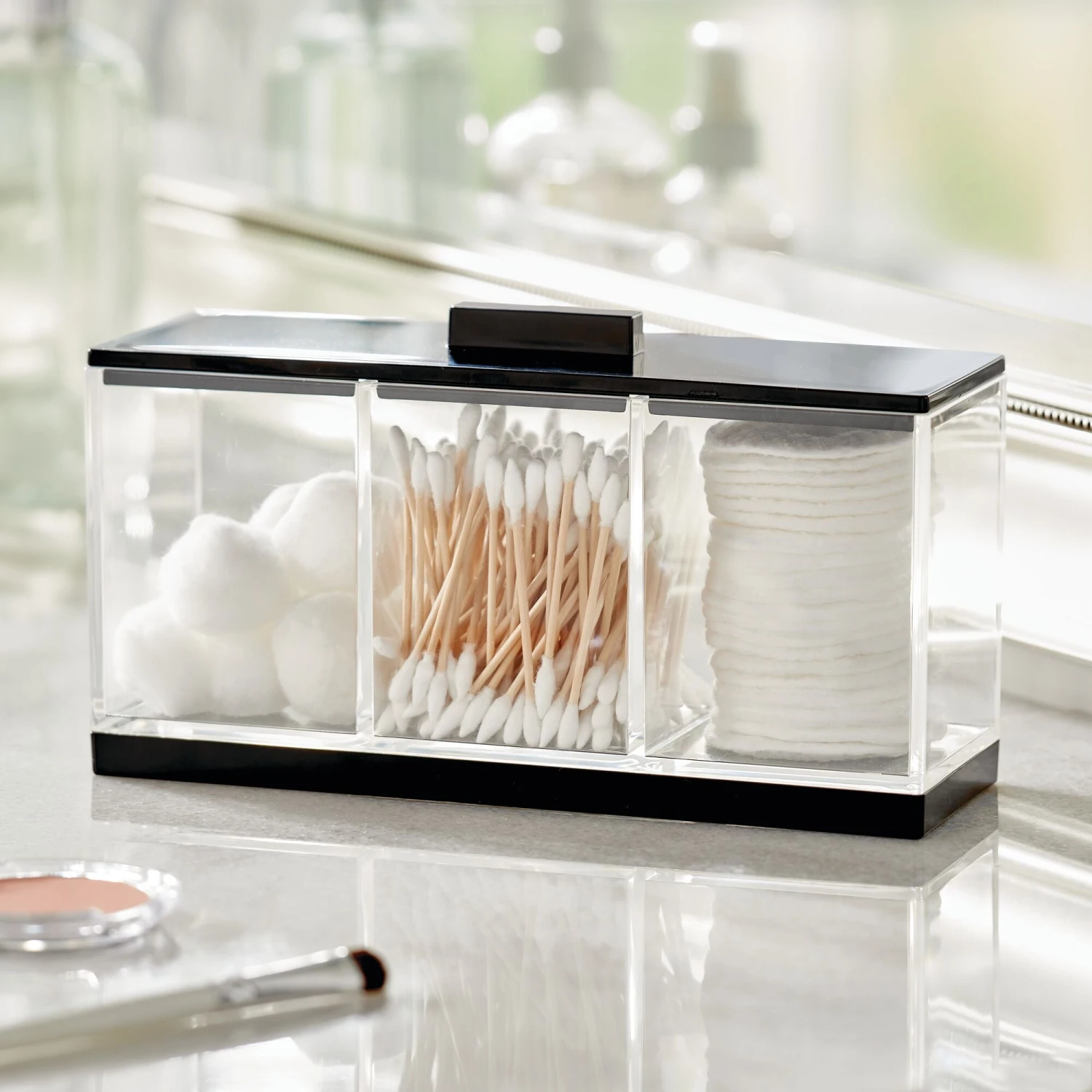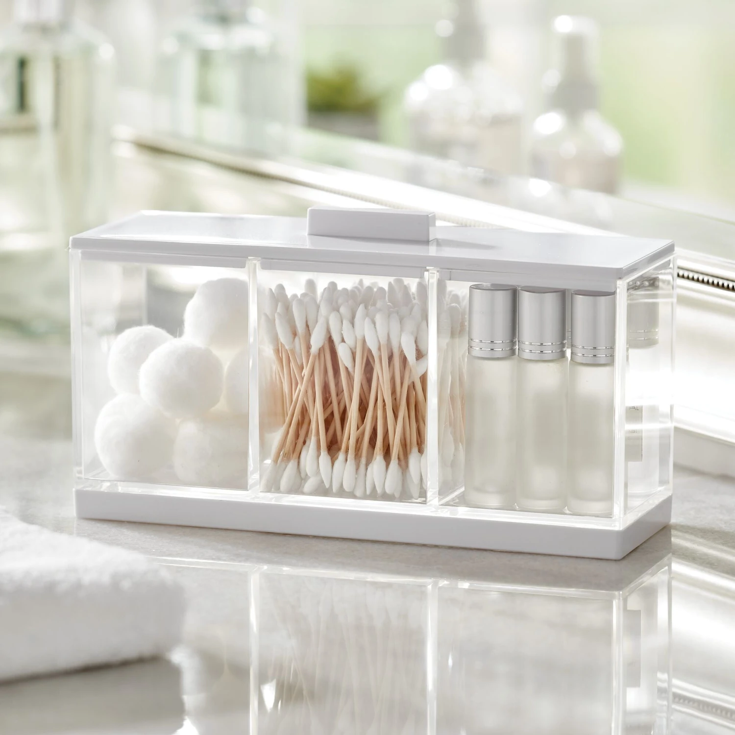 Create a more put-together counter with our 3-Section Bathroom Canister. Our counter-worthy canister allows you to store everyday items like cotton balls, bath salts, and makeup pads in three divided sections keeping contents visible and separated. Complete with a nesting lid, these canisters provide a clean, modern look to your surrounding décor.