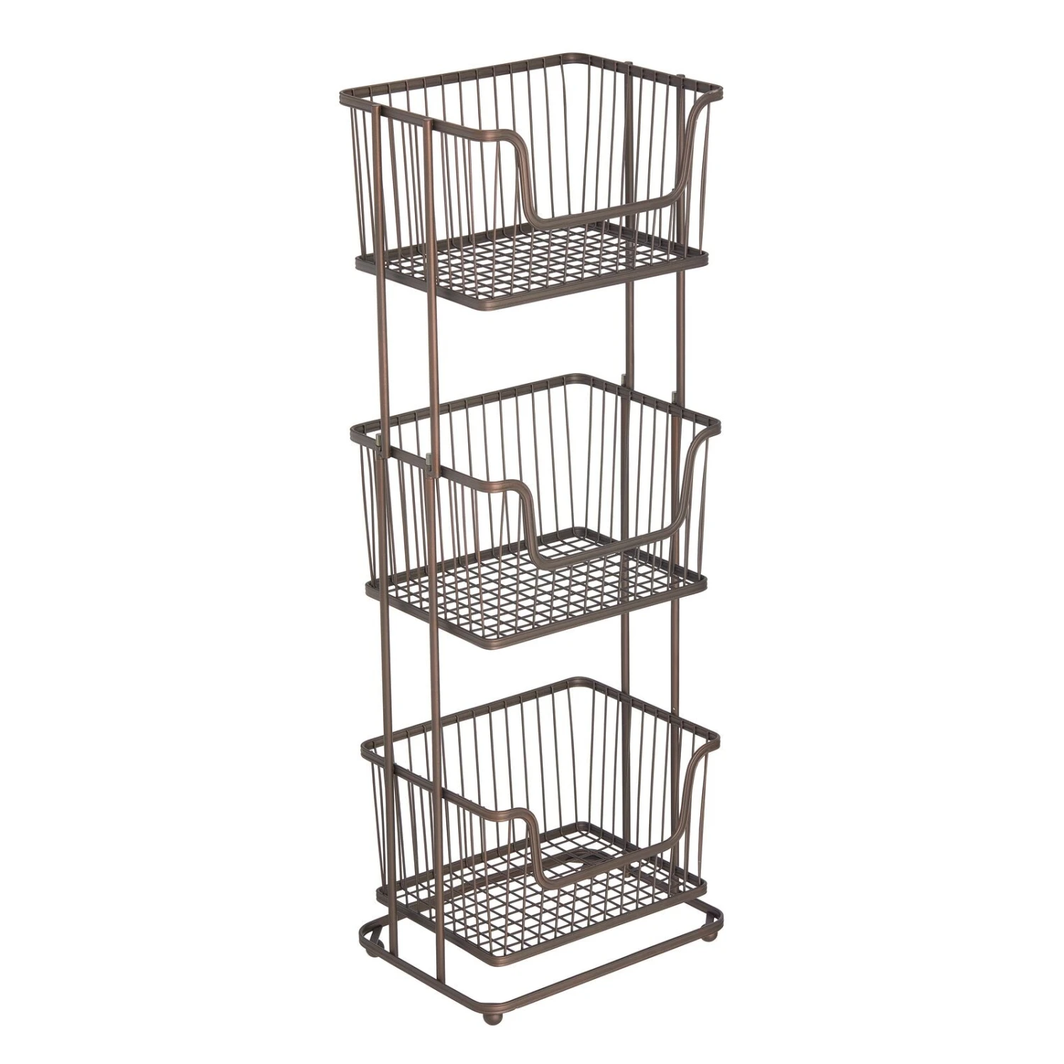 Our 3-Tier Wire Basket Stand makes the most of unused corner spaces. Providing three tiers of storage, each open-wire basket features a front cutout detail for easy reach-in access to bathroom basics. This organizer works beyond the bathroom and provides convenient storage to any laundry room, garage, or wherever you need organizing.