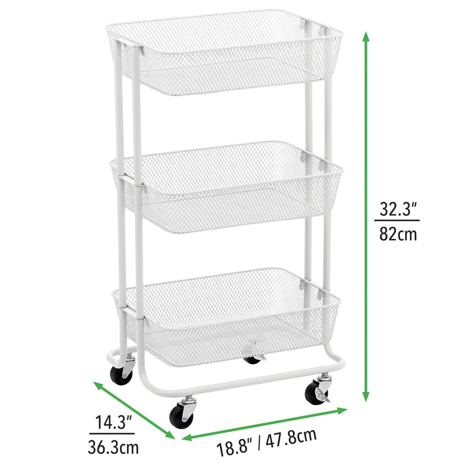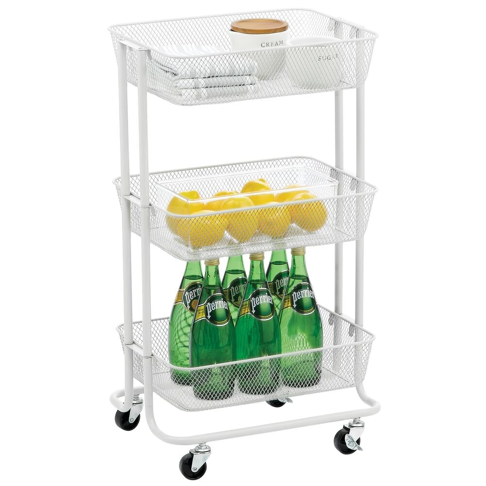 Add instant storage to any room in your home with this 3-tiered rolling cart, ideal for small living areas and rooms with little counter space available. Use this cart for kids’ and baby toys, as a homework or craft station, as a plant stand, in a dorm room to contain odds and ends, and more. 4 rolling caster wheels make this cart easily portable.