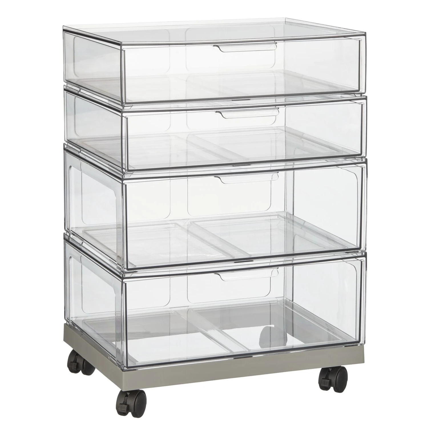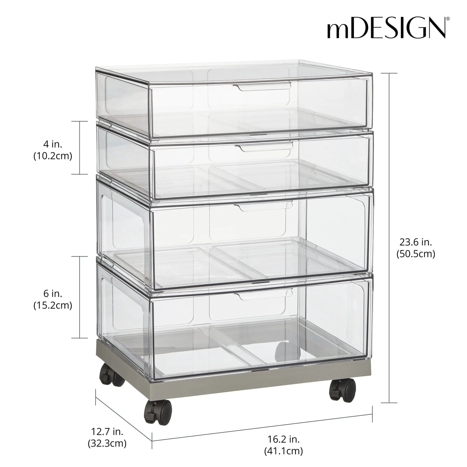 Our 4-Drawer Rolling Cart is just what you need to keep your hobby, office, or school supplies organized. Four easy-sliding drawers of varying sizes provide space to store yarns, paints, paper, and so much more. This rolling craft cart is mounted on four swivel locking casters, allowing you to move or secure wherever you need.