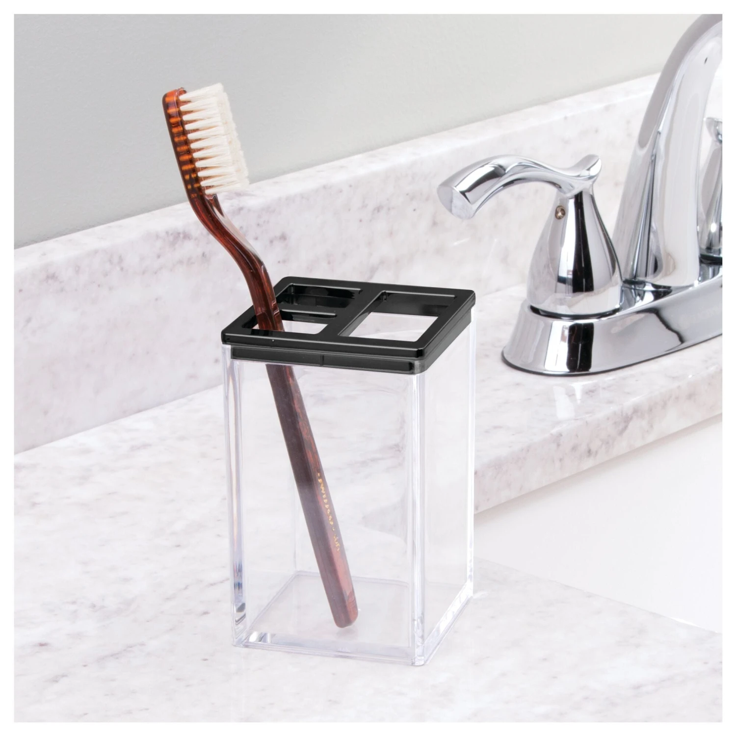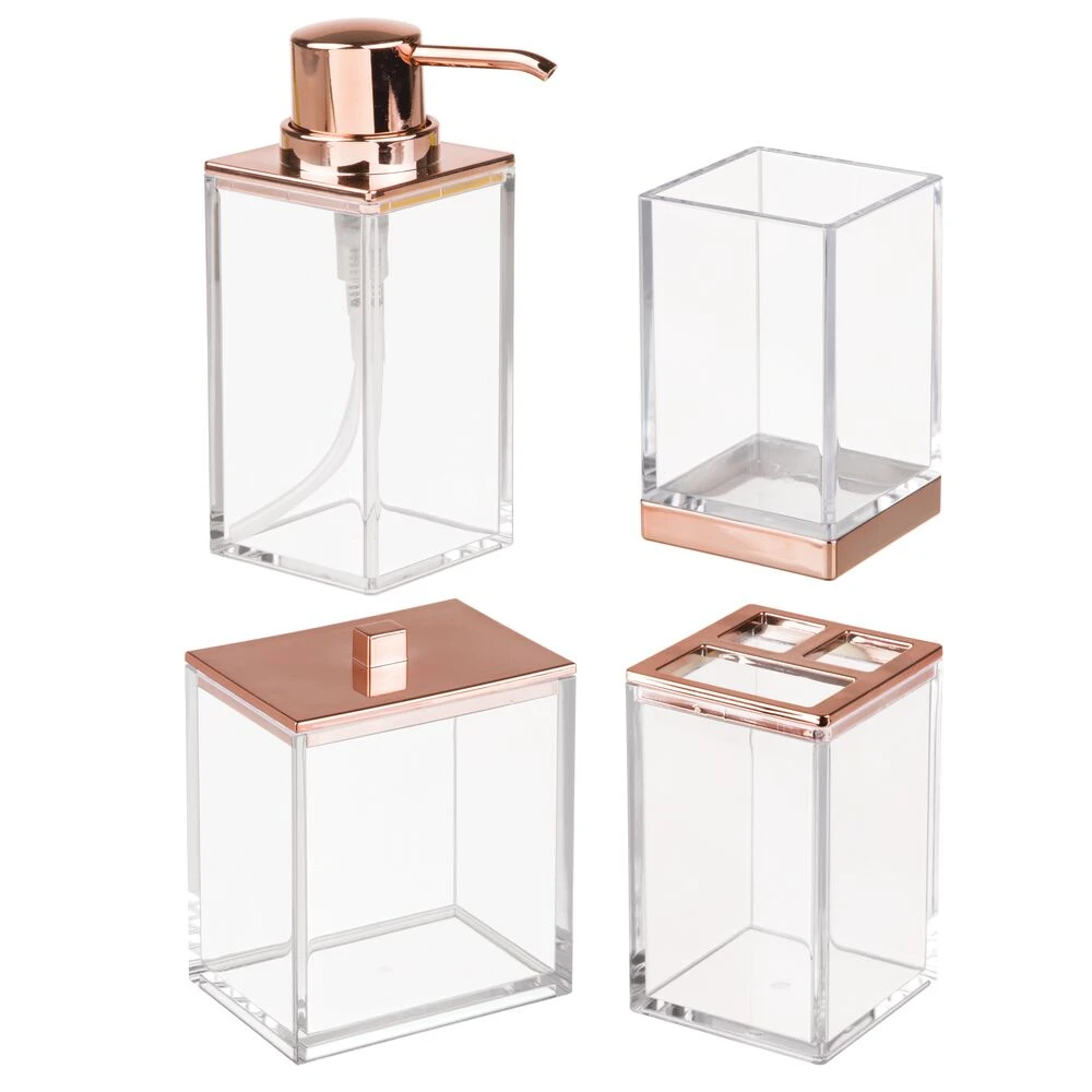 Create a cohesive look in any bathroom with this matching set which includes a refillable liquid soap dispenser, divided toothbrush stand, lidded canister, and a tumbler rinsing cup. Perfectly sized for large or small bath spaces, these sink-side necessities elevate your bathroom vanity while simplifying your morning and nighttime rituals.