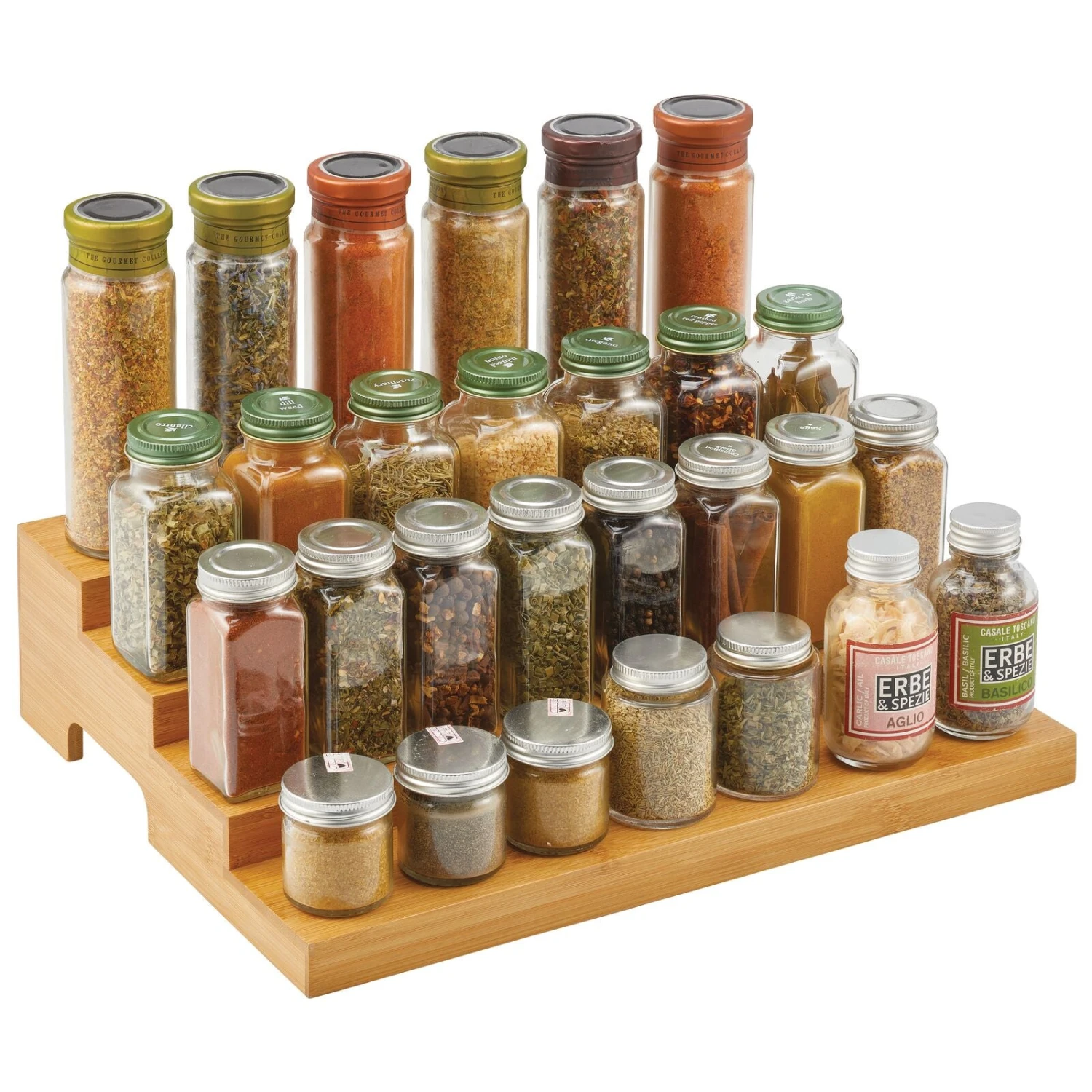 Our 4-Tier Bamboo Shelf keeps your favorite herbs within reach by creating a better vantage point inside cabinets. Made of natural bamboo, this shelf organizer features four open shelves that put spices and condiments on full display for easy access. This organizer pulls double duty by sorting vitamins and medicine bottles in bathrooms.