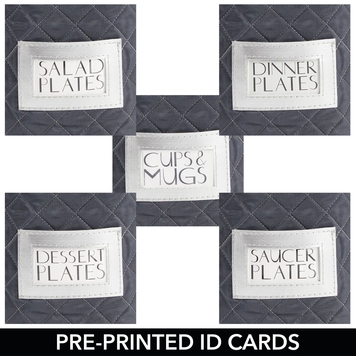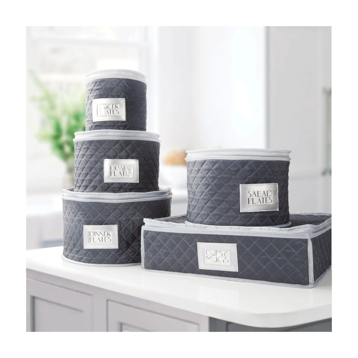 Designed specifically to hold special occasion dinnerware, our 5-Piece Quilted Dinnerware Storage Set prevents plates or cups and mugs from scratching. Each bin holds a complete service for twelve and includes felt separators so you can stack without worrying. Efficiently label the contents of each bin with the included label holder and tags.