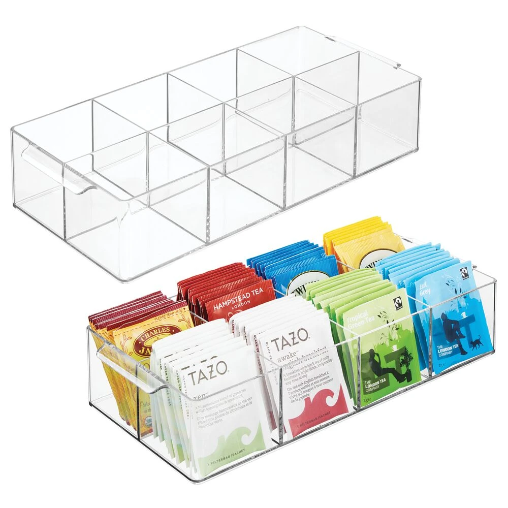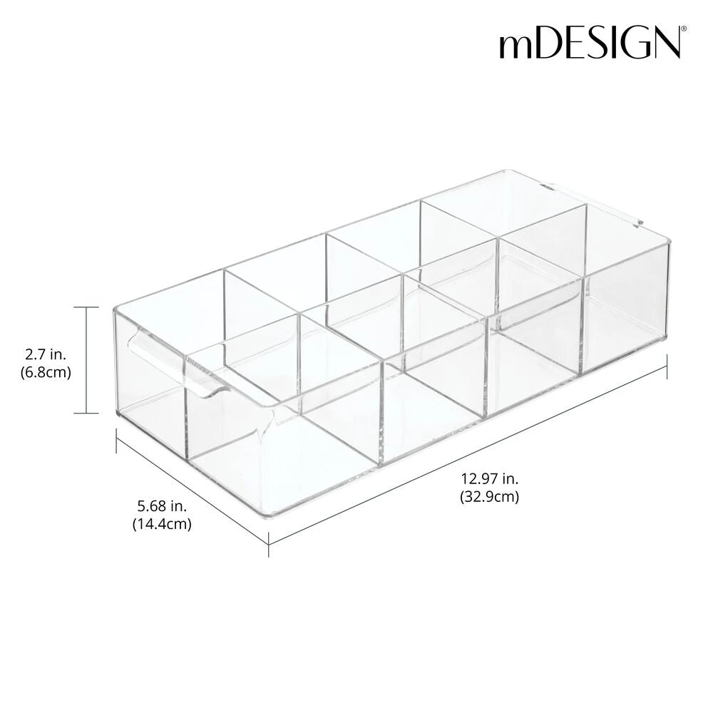 Our 8-Section Organizer bin helps streamline crowded kitchen spaces by keeping go-to items like sugar packets, sweeteners, and tea bags sorted with divided compartments. Handy organizer features two side handles making it easy to transport from cabinet to counter or wherever you need. Also works as a drawer organizer — check height to ensure fit.