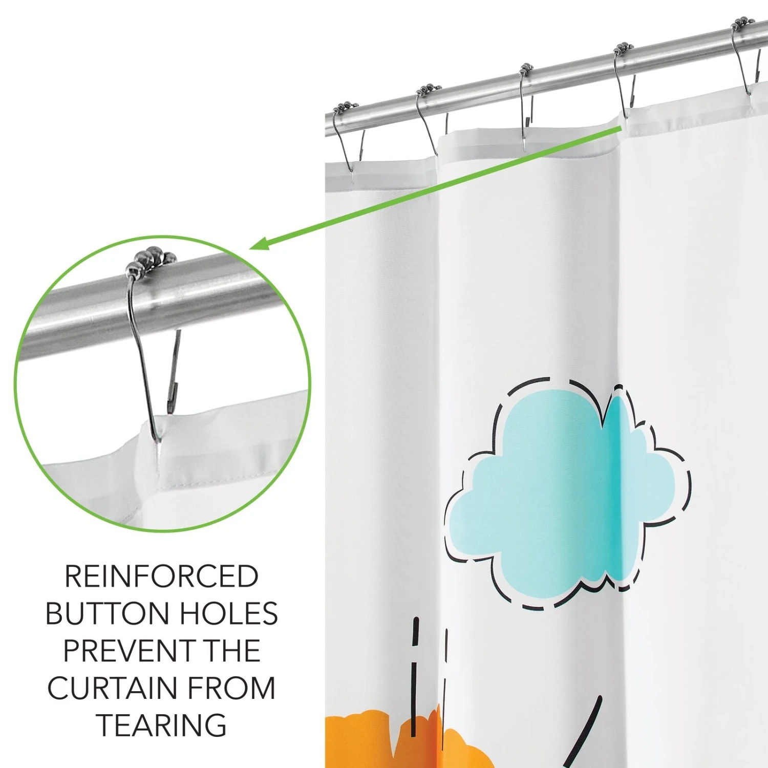 A lighthearted lion decorates with this playful shower making bath time a fun time. Crafted from long-lasting polyester that drapes beautifully, add whimsy and charm to any kids’ bath or guest bath. Curtain hangs by twelve reinforced buttonholes for easy hanging. A shower curtain liner is recommended.