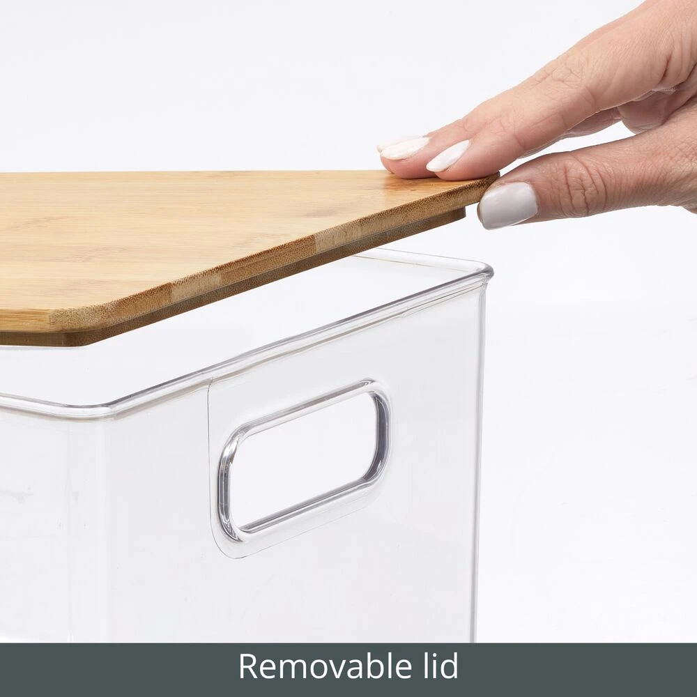 Clear countertop clutter with our Stackable Kitchen Bin. The open-top concept grants reach-in access to often-needed pantry staples, and the cutout handles provide easy portability wherever you need. The accenting bamboo lid brings a natural look to home organizing while keeping contents protected. Stack bins or use side by side for custom storage.