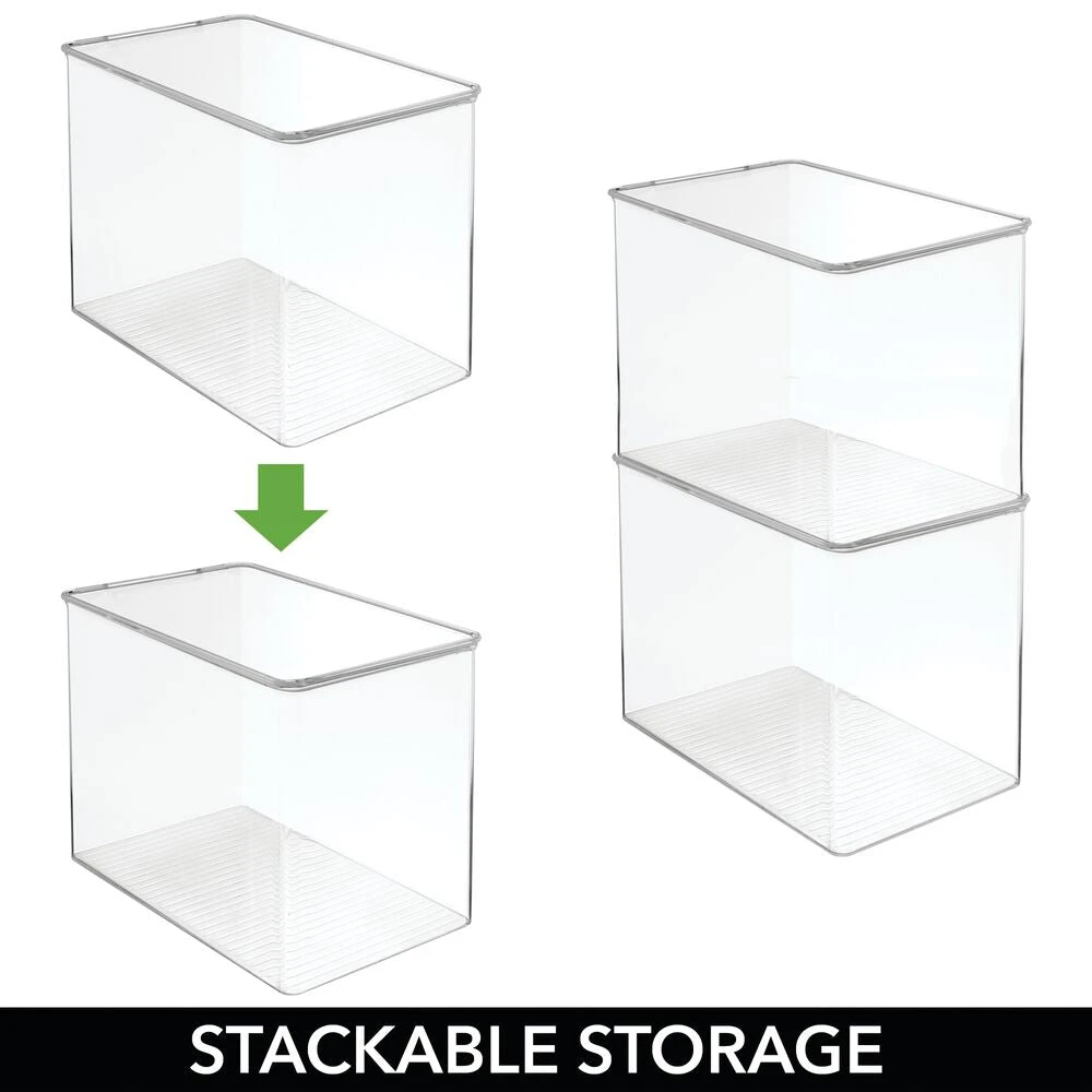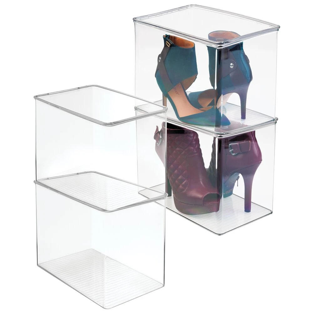 Our Clear Stackable Shoe Box comfortably holds one pair of shoes, and the hinged lid protects against dust while keeping your favorite pair easily accessible. Bins stack securely, allowing you to optimize closet space. This clear, versatile solution organizes other small accessories for stunning, sophisticated storage anywhere you need.