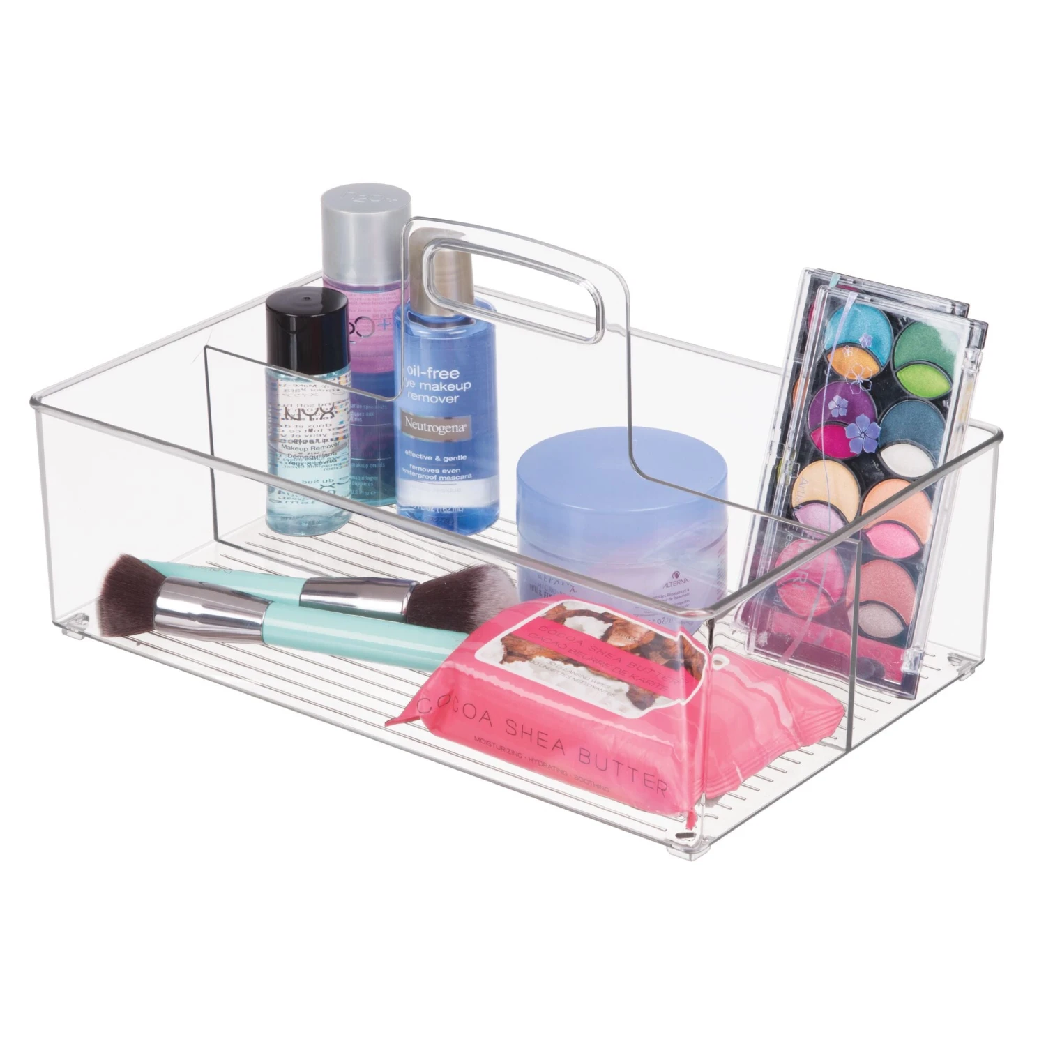 Restore order on any vanity with this Divided Makeup Caddy. Versatile and lightweight, this storage caddy keeps necessities separated with two spacious compartments that accommodate larger items so whatever you need is always within reach. An integrated handle provides effortless portability so you can tote your makeup essentials anywhere.