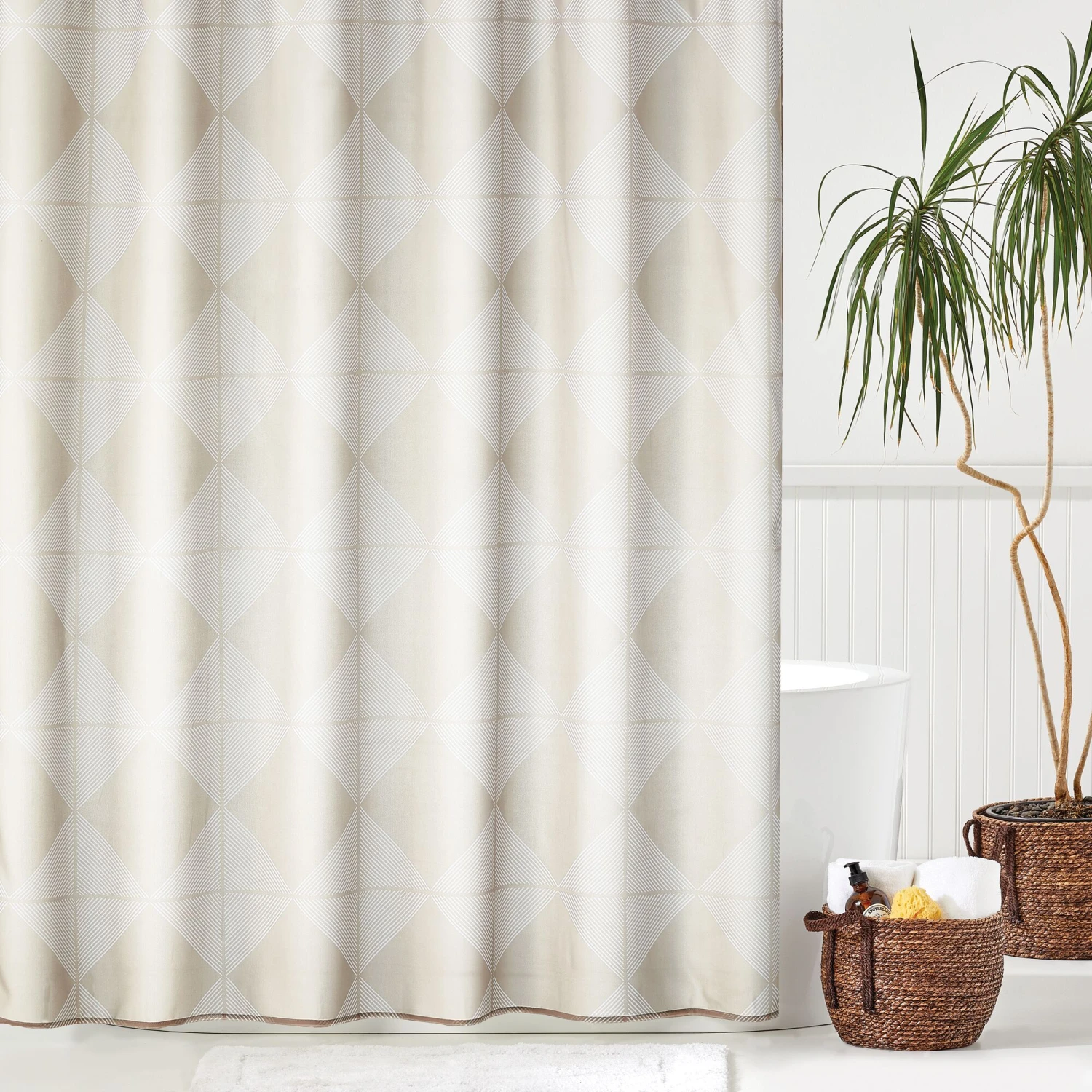 Repeating geometric diamonds add modern style to any bath or shower space. This curtain features a long-lasting and smooth polyester construction with a luxurious drape that will instantly refreshes any half bath, guest bath, or master bathroom. A shower curtain liner is recommended.