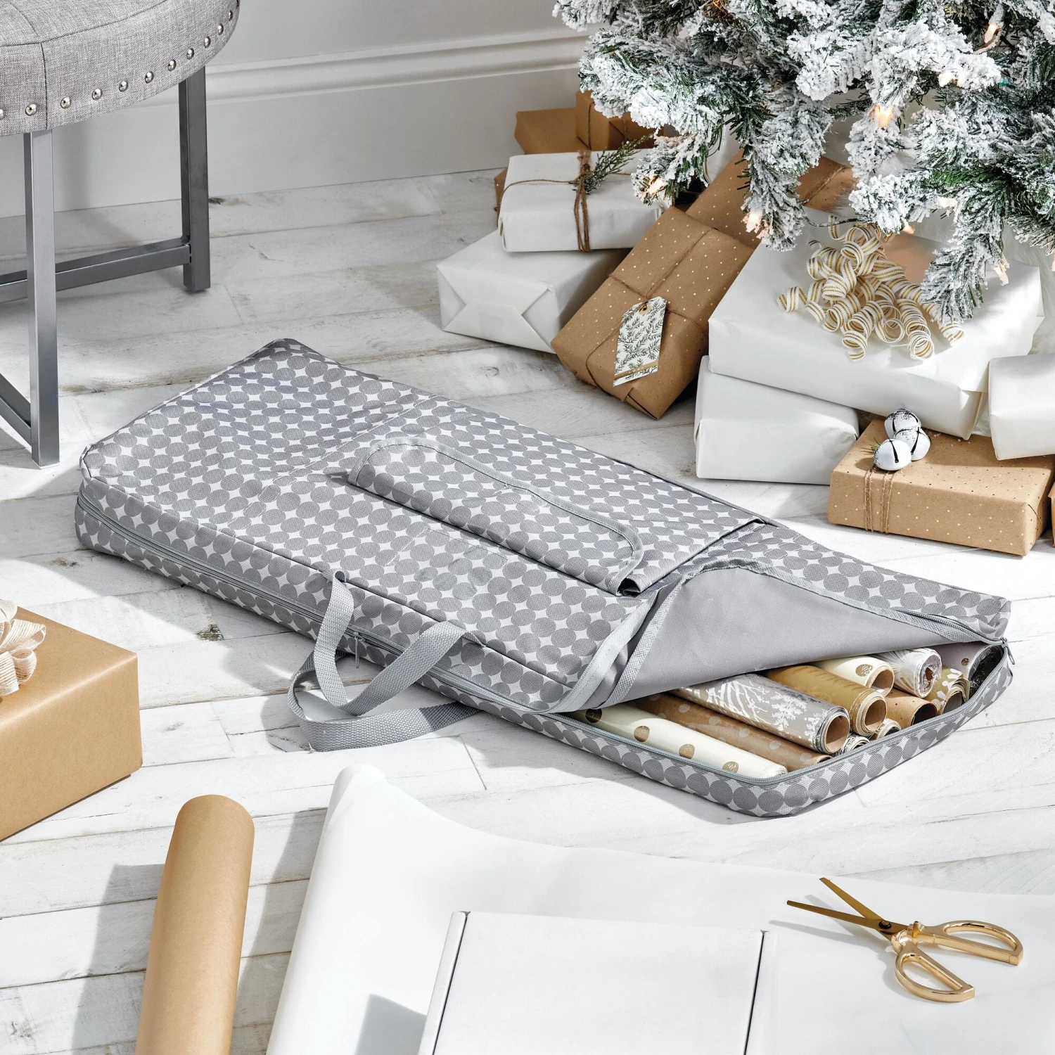 This is the all-in-one gift-wrapping storage solution you need to master the holidays. Store gift-giving essentials like wrapping paper, ribbons, bows, and more. The low profile allows you to store under beds or sofas utilizing often-wasted space. This gift wrapping essential is complete with a front label holder and outer pocket.