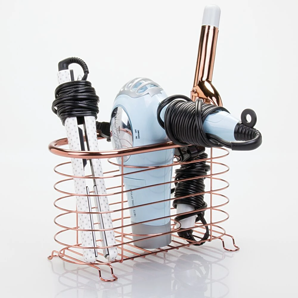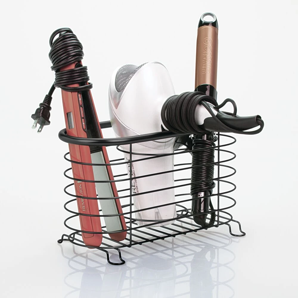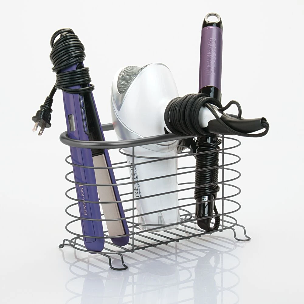Organize styling accessories with this Countertop Hair Care Organizer. Three sections hold the tools you need for a great hair day. This basket keeps cords untangled and tucked away. Hold hot tools, brushes, or styling products. Place on a vanity or makeup table for instant access. The compact design lets you make the most of small spaces.