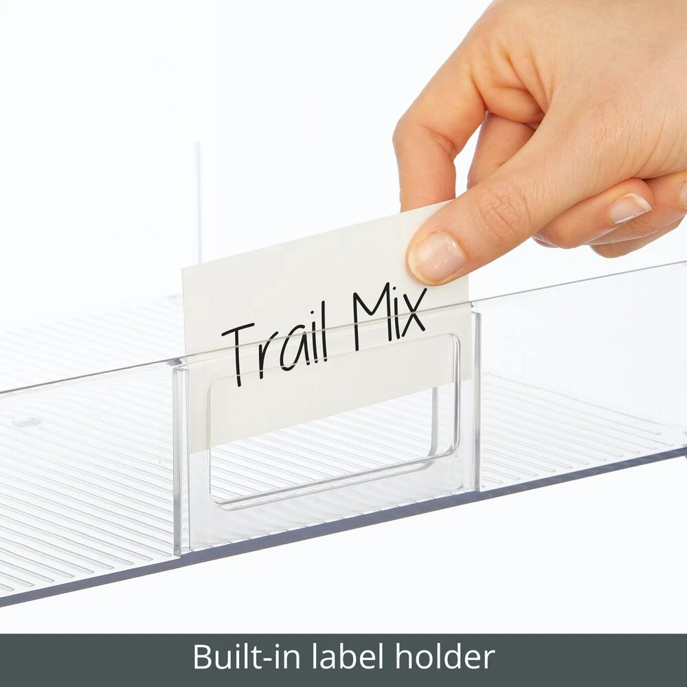 Neatly stow away kitchen essentials with these Versatile Open Front Kitchen Bins. The front cutout provides easy access to pantry staples like snacks, cans, or jarred foods while the clear construction brings a modern look to any open shelf. For a finished look, the included front label holder sets you up for long-term organizing success.