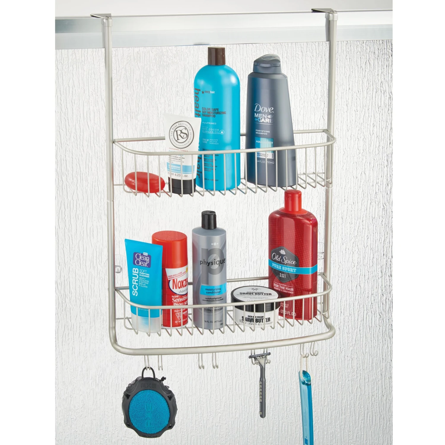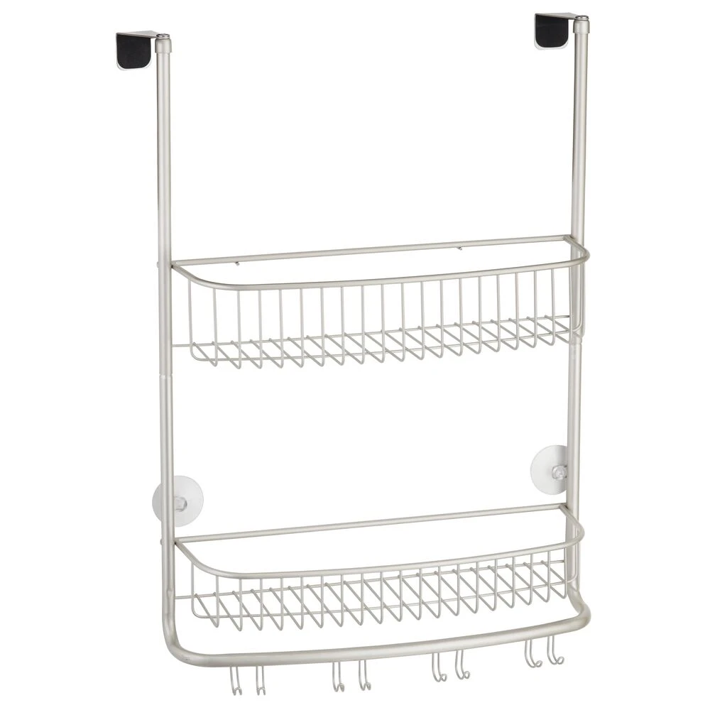 Save space and enjoy instant shower organization with our Over-the-Door Shower Caddy. Two basket-style shelves hold various size bottles, and the eight hooks below hang a loofah, razor, or other bath necessities. Caddy fits on any shower door, and suction cups keep it from shifting. Open grid design allows for proper drainage and air circulation.