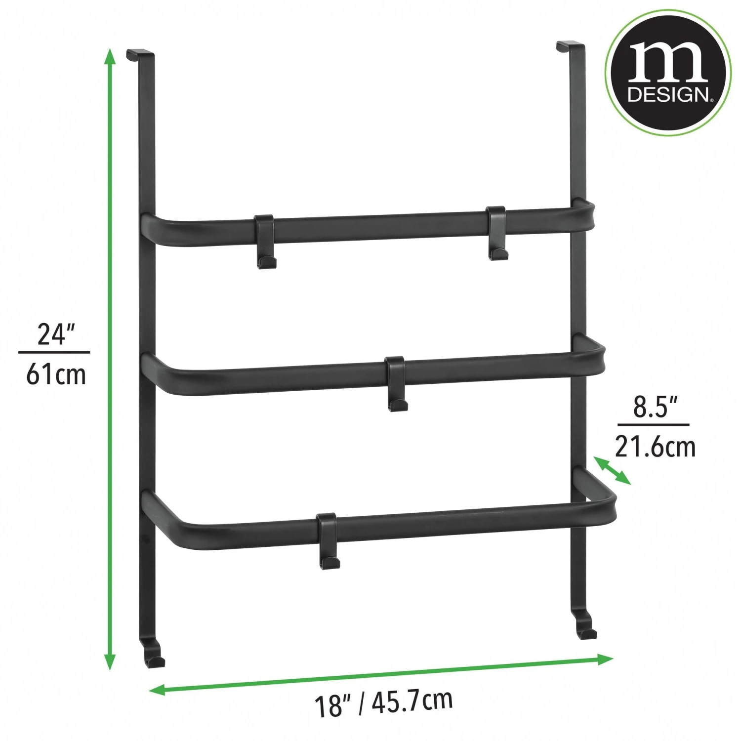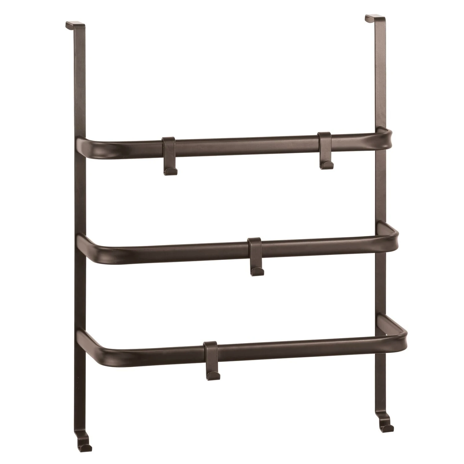 Our Over-the-Door Towel Rack features three tiers of storage while providing a space for towels to dry. Each tier features adjustable accessory hooks to suit your needs and hold various bath essentials. Not limited to just the bathroom, this rack also works behind closet doors as an accessory organizer to store scarves, hats, and more.