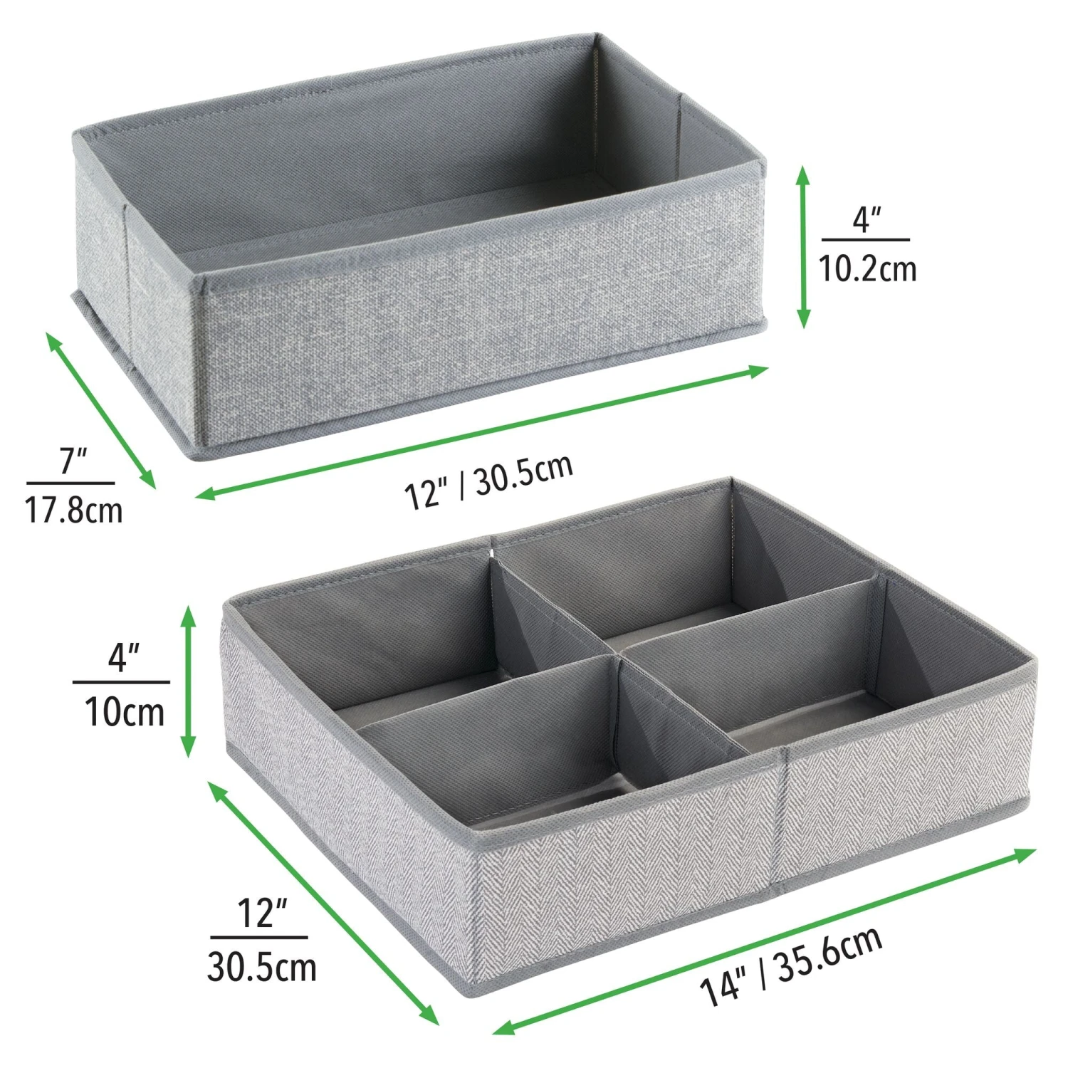 Fabric organizers are the perfect solution to tackle cluttered closets or dresser drawers in bedrooms and nurseries. This 4-piece set includes two open organizers and two compartmentalized organizers to create a customized drawer storage solution that keeps everything from diapers to accessories separated, organized, and easily accessible.