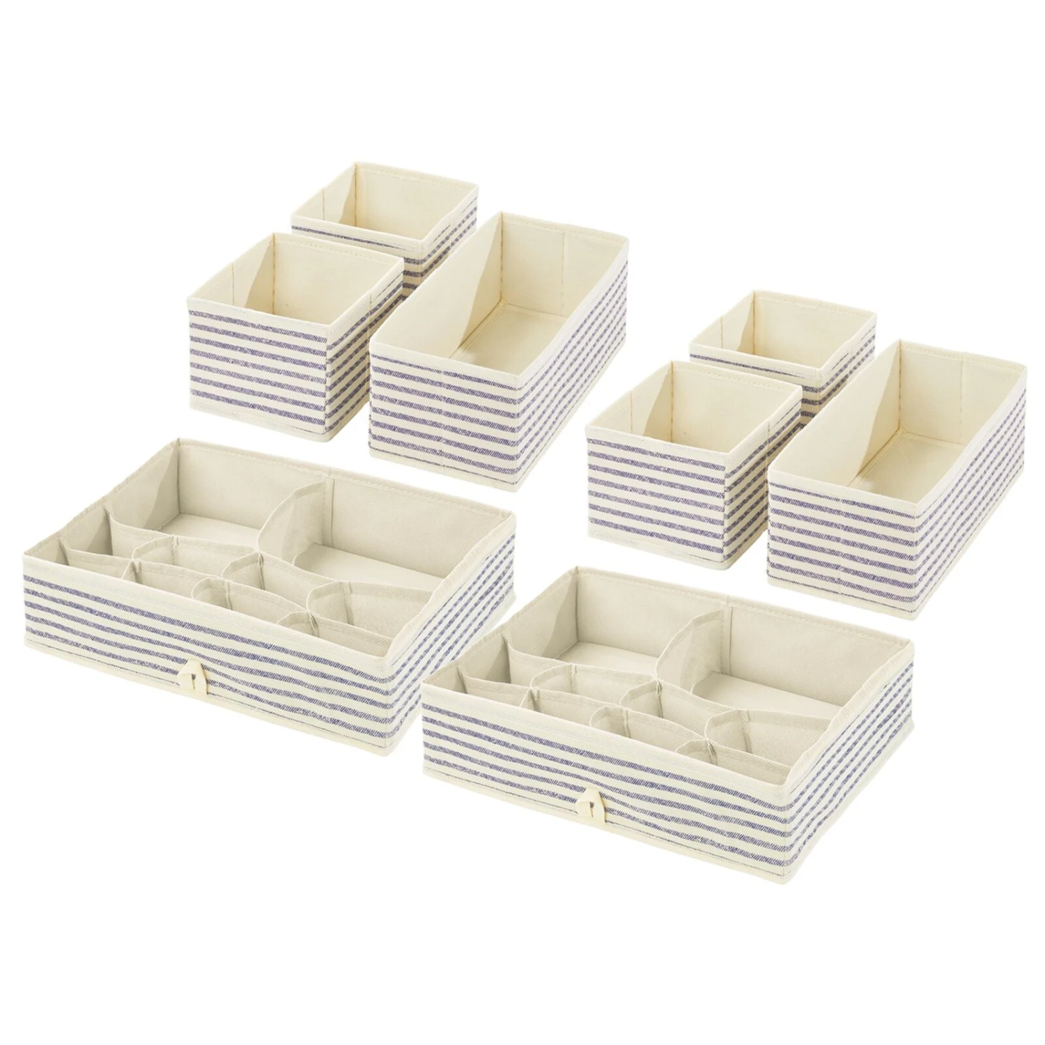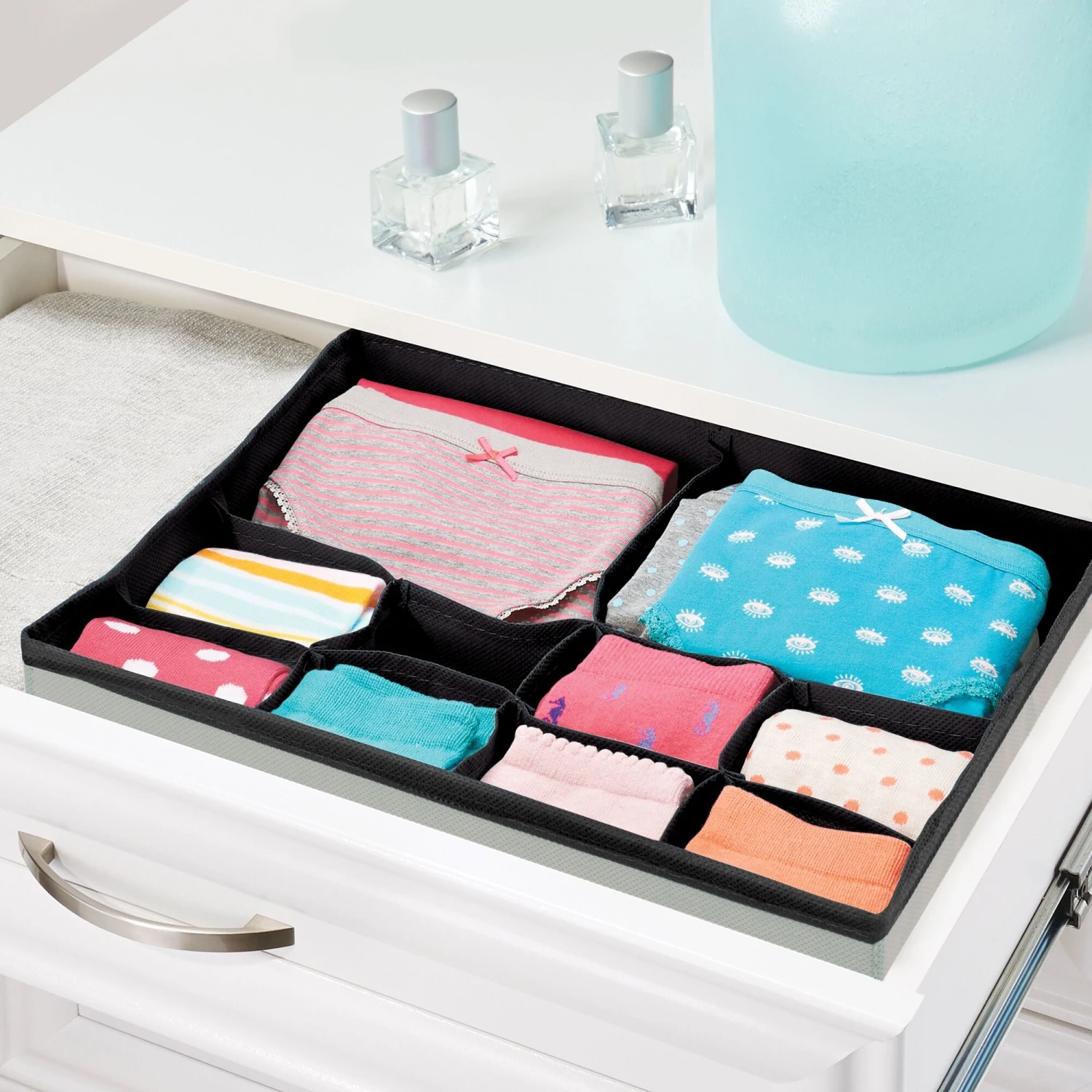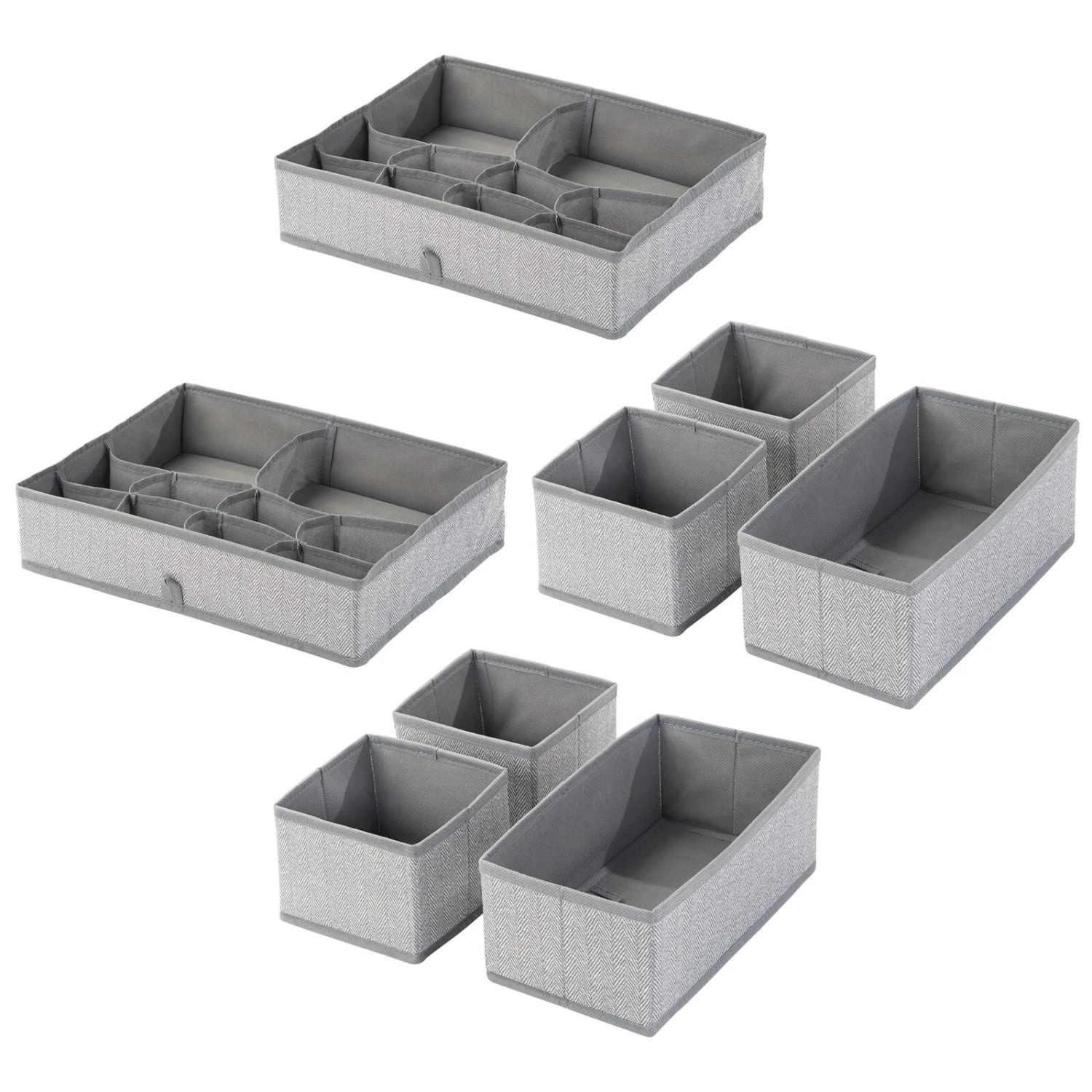 Fabric organizers are the perfect solution to tackle cluttered closets or dresser drawers in bedrooms and nurseries. This 8-piece set includes six open organizers and two compartmentalized organizers to create a customized drawer storage solution that keeps everything from undergarments to accessories separated, organized, and easily accessible.