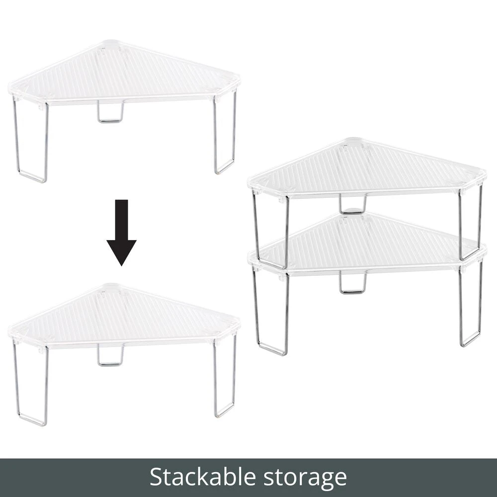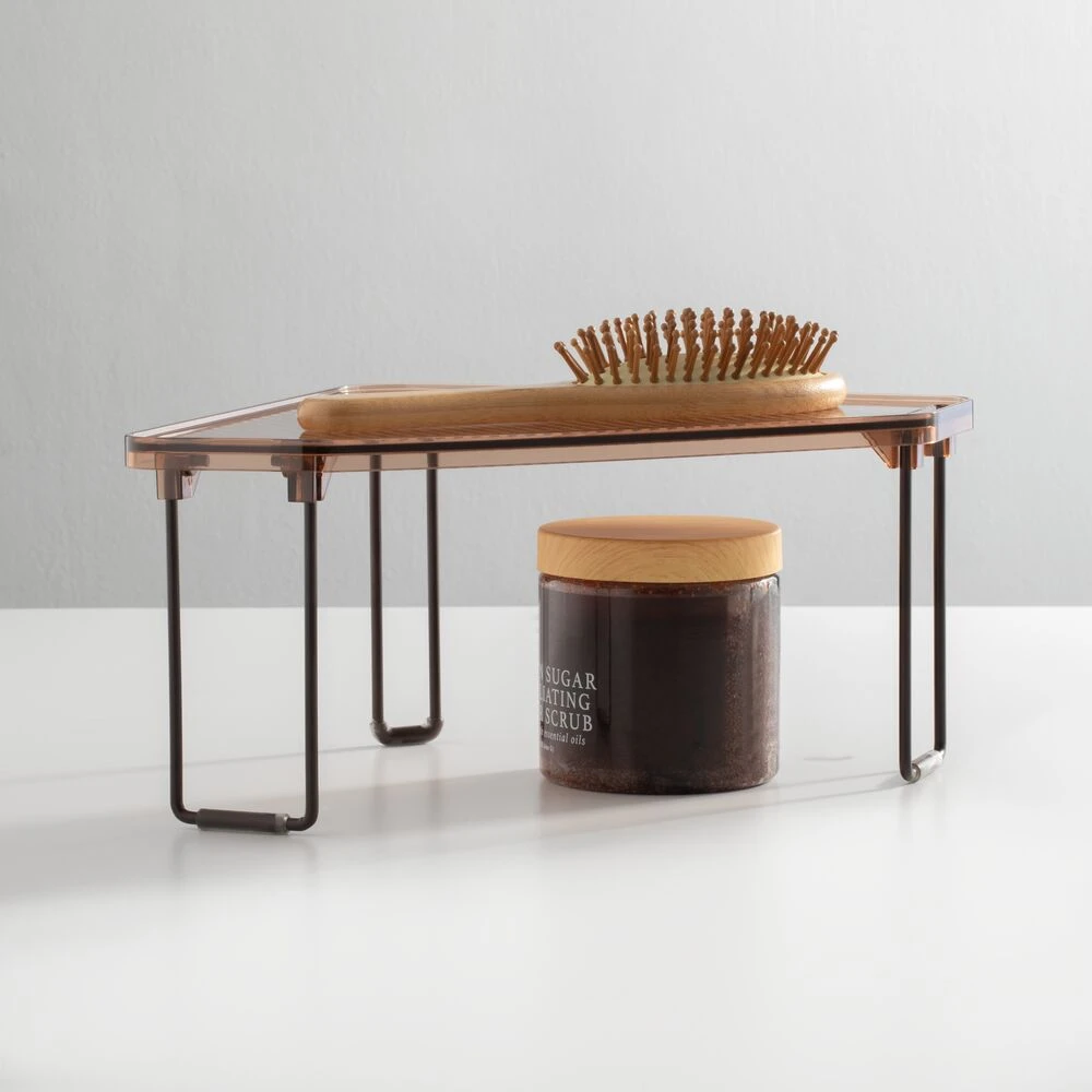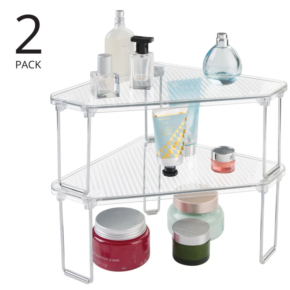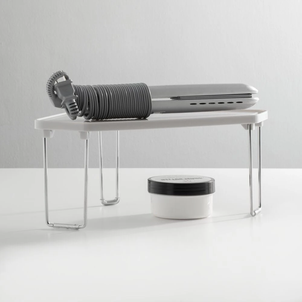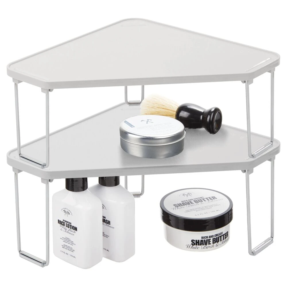 This corner shelf makes the most of the unused storage space on your bathroom countertops, inside cabinets, and under the sink with its space-saving triangular design. It instantly creates two levels of storage making it easy to maximize small spaces by providing double the capacity, and the shelves fold flat for compact storage when not in use.