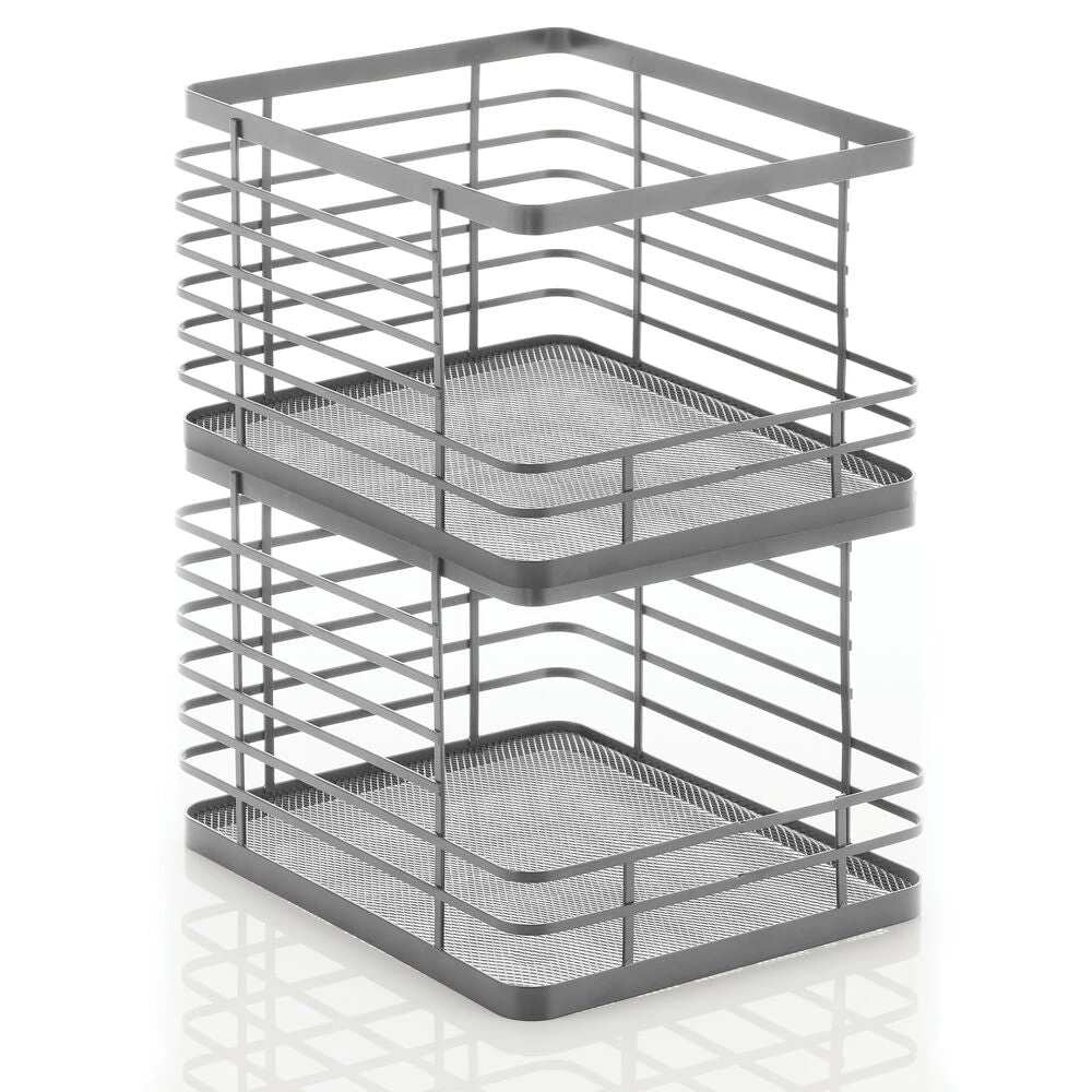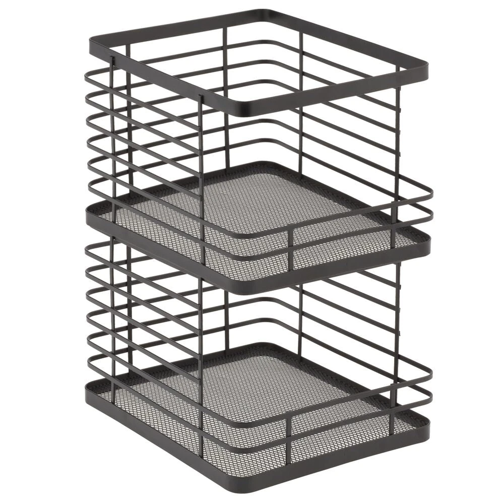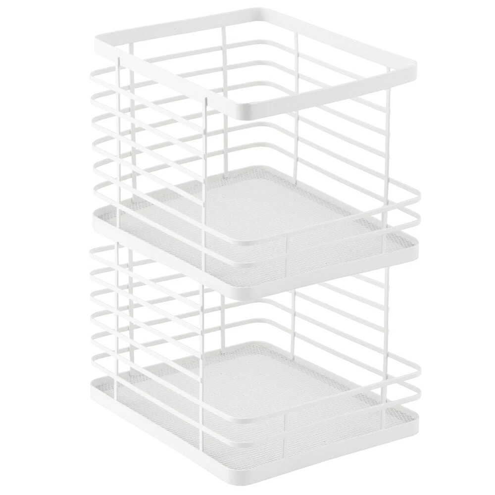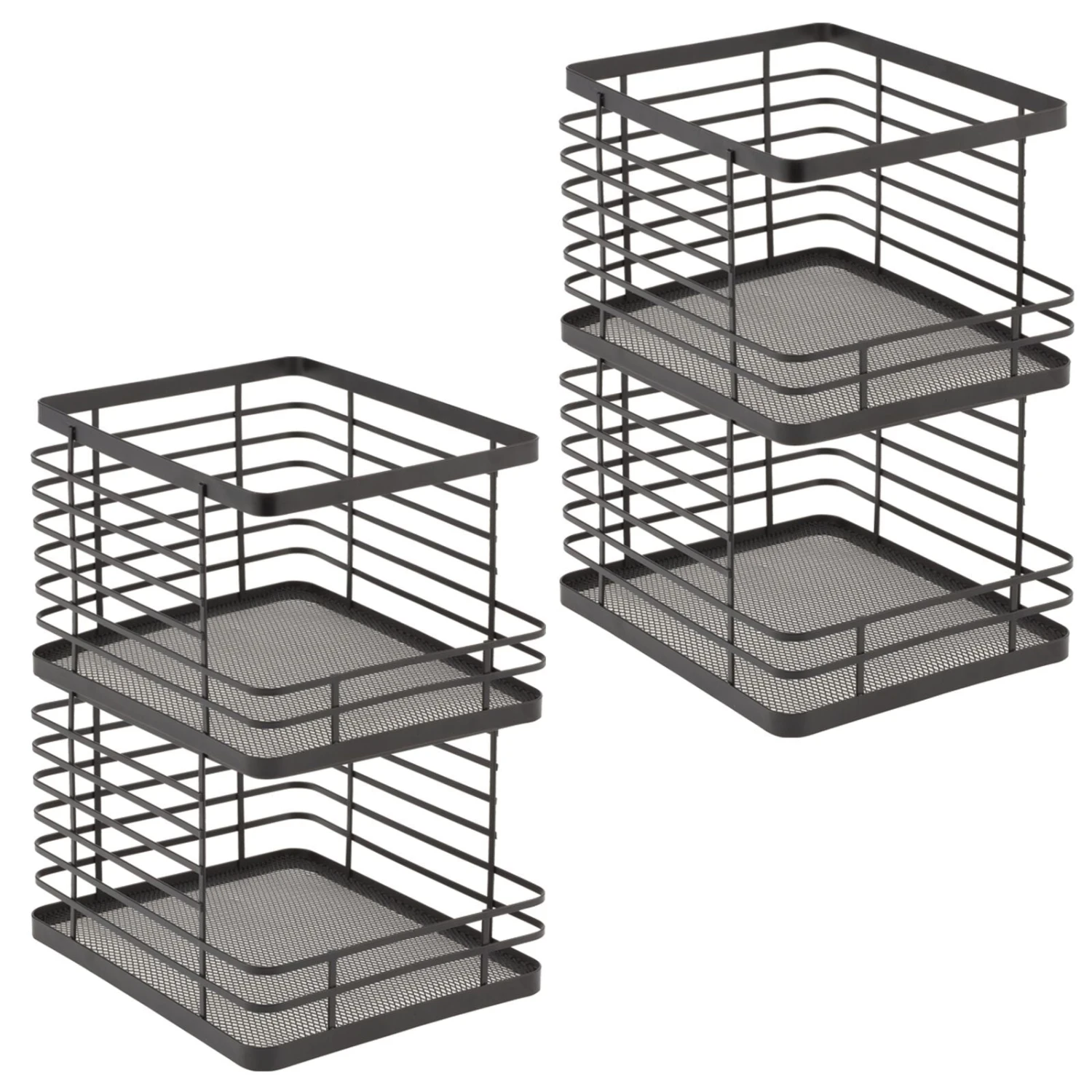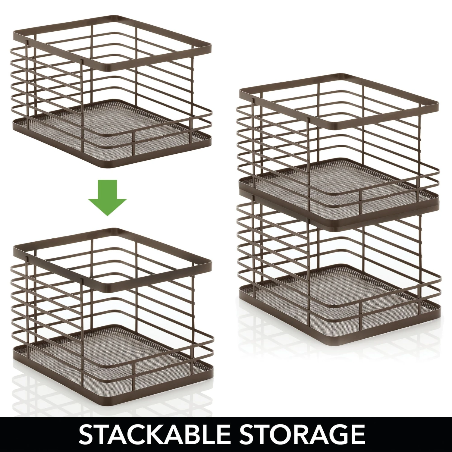 Our Stackable Wire Baskets are a must-have for all your kitchen storage needs. These airy, open-wire baskets feature a front cutout detail that provides easy access to pantry staples like snacks, cans, or jarred foods. Each basket stacks to make use of vertical space creating a reliable space-saving storage solution.