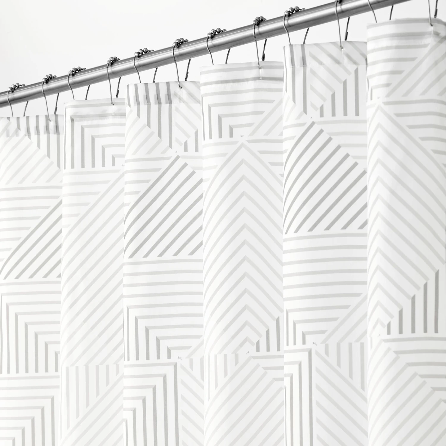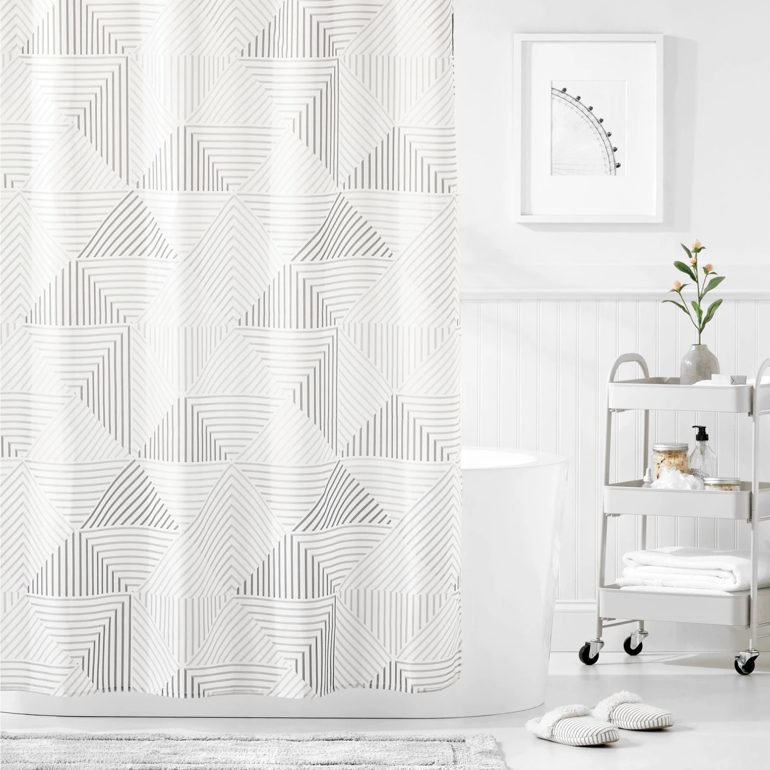 Our Decorative Triangle Shower Curtain features horizontal and vertical lines, creating a larger, all-over triangle pattern for a playful spin on the classic geometric pattern. The polyester construction drapes beautifully and withstands daily use. The curtain hangs by twelve reinforced buttonholes for easy hanging.