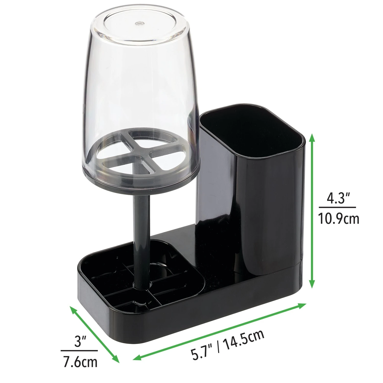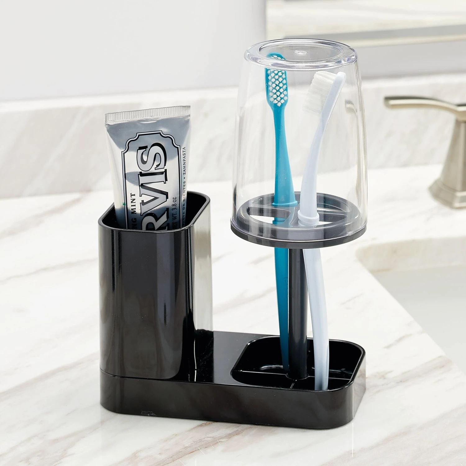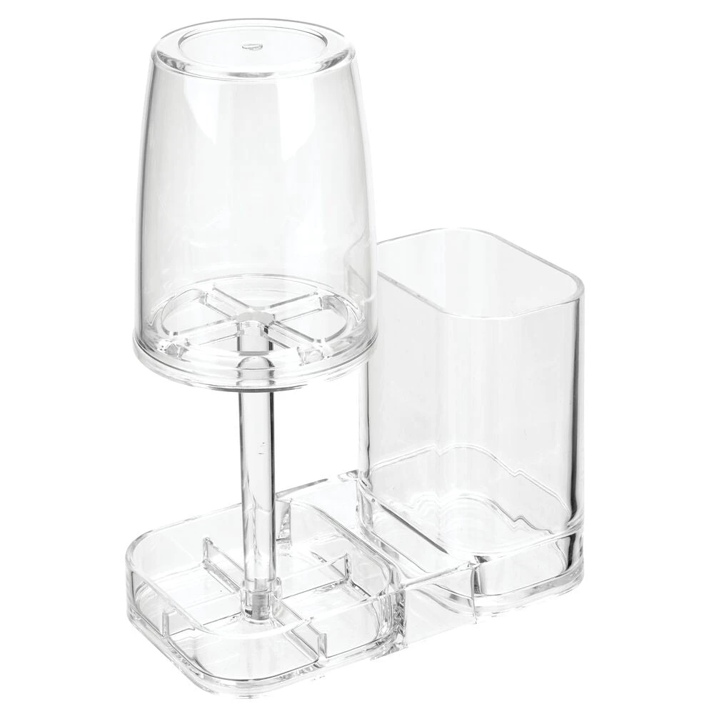 This Toothpaste & Toothbrush Stand stores daily dental hygiene necessities on the bathroom counter, vanity or even inside a medicine cabinet. This holder features a tumbler cup for rinsing that sits on top of the toothbrushes and cleaning instruments to keep them free of dust and debris. Its slim profile fits on the sink where space is limited.