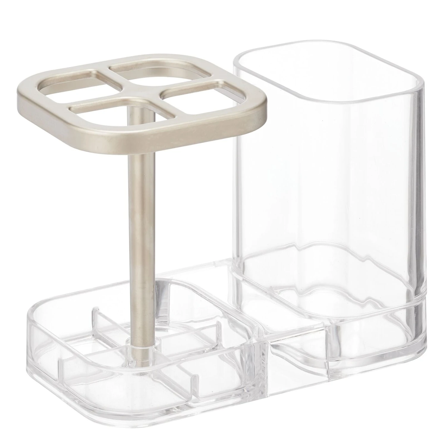 Keep your toothpaste and toothbrushes in one central location with this compact dental care organizer. It has compartments to hold four toothbrushes as well as a designated bin for toothpaste, floss, and other dental hygiene accessories. The slim design fits on small bathroom sinks and vanities, preventing cluttered counters.