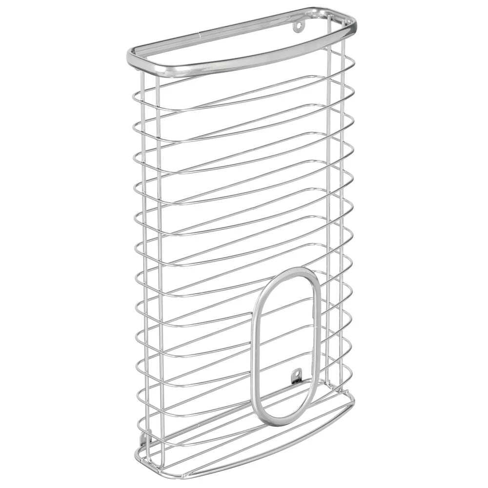 Store plastic bags in one convenient place with our wall mount organizer. Open wire design lets you quickly grab plastic grocery bags or trash bags, and the open top and cut out in the front make grabbing a bag quick and easy. Included hardware allows you to mount organizer to any wall or inside any kitchen cabinet door.