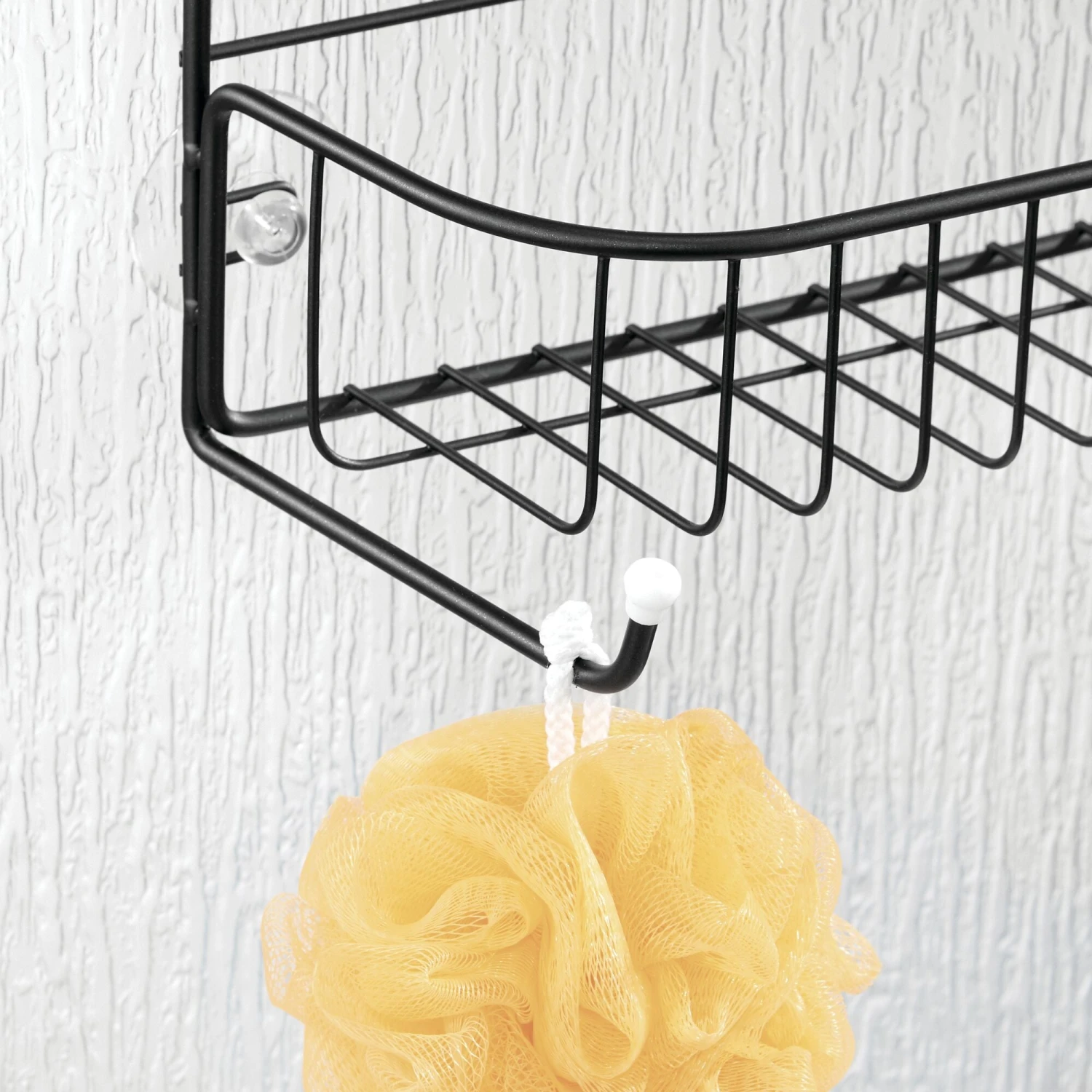 Save space and enjoy instant shower organization with our Over-the-Door Shower Caddy. Two basket-style shelves hold various size bottles, and the two hooks below hang a loofah, razor, or other bath necessities. Caddy fits on any shower door, and two suction cups keep it from shifting. Open grid design allows for proper drainage and air circulation.